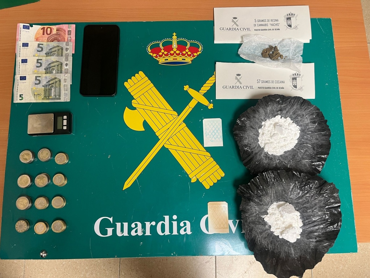 Agentes del Puesto de la Guardia Civil de Ocaña han detenido a un varón como presunto autor de un delito contra la salud pública por tráfico de drogas, tras ser sorprendido en la vía pública portando 57 gramos de cocaína en roca, así como dinero en efectivo fraccionado, supuestamente procedente de la venta de la sustancia.