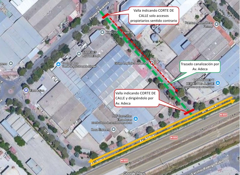 Para los que salgan de la ITV, la valle de señalización indicará también el corte y los dirigirá por Calle F hacia Primera Avenida, mientras que los vehículos que circulen por Avenida Adeca, en el cruce con Calle E se dispondrá de valla con la señalización indicando el corte de calle dirigiéndolos por Calle E.
