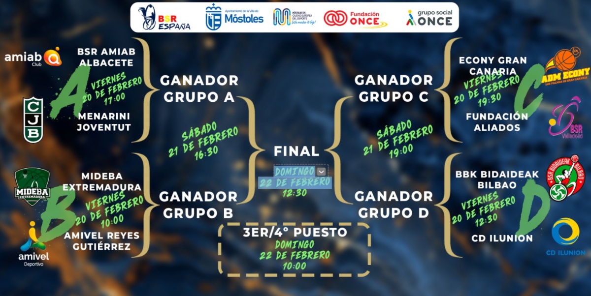 Los cuartos de final se jugarán el viernes, mientras que las semifinales serán en la tarde del sábado y la gran final el domingo por la mañana. La Copa del Rey está organizada por la Federación Española de Deportes de Personas con Discapacidad Física y cuenta con el patrocinio y apoyo de varias instituciones públicas y empresas privadas.