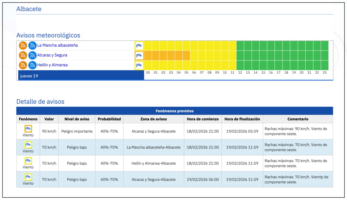 Las previsiones de cara a este jueves en Albacete capital y su provincia no son muy halagüeñas a tenor de las expectativas que pone la AEMET sobre la mesa.