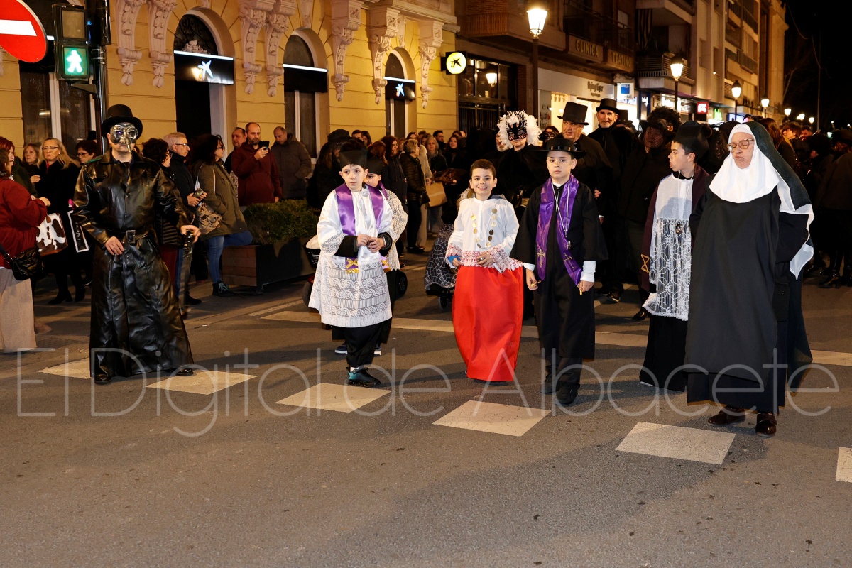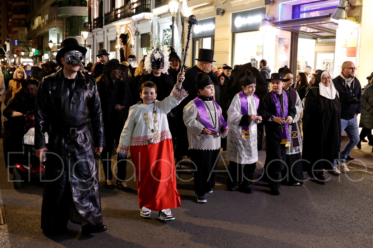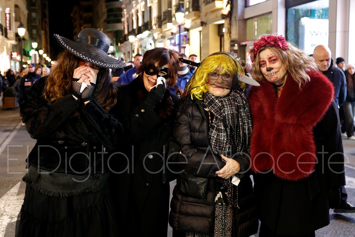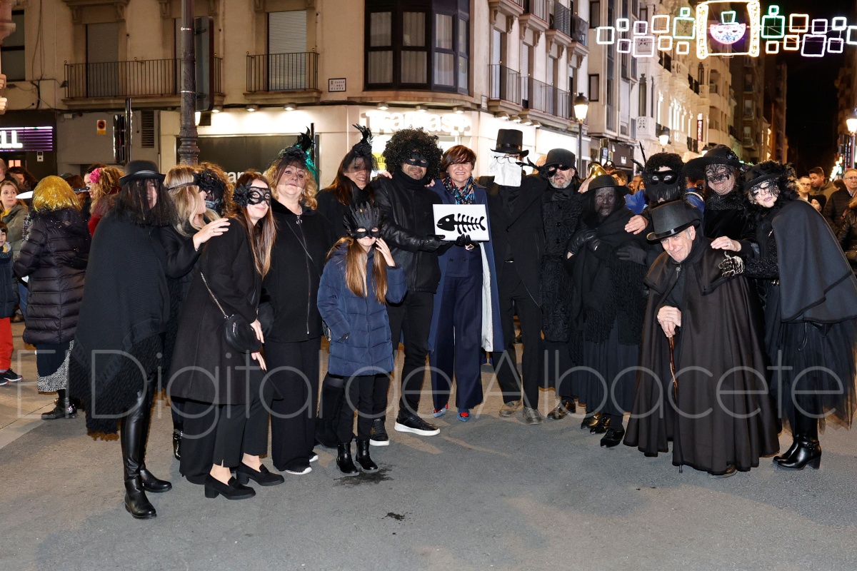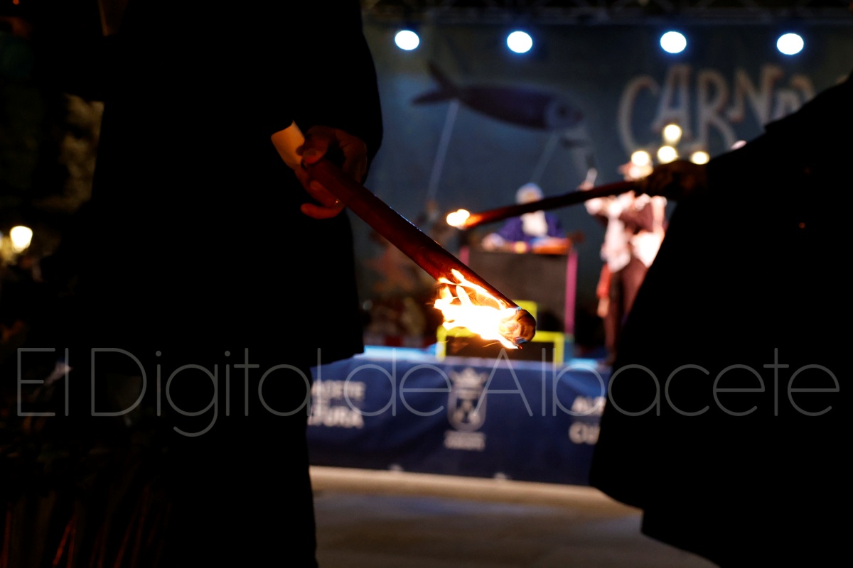 Posteriormente, al filo de las 20:30 horas, el cortejo recorría las céntricas calles Tesifonte Gallego y Marqués de Molins. De riguroso luto y compungidos por el Entierro la Sardina, los participantes se dirigían hasta la Plaza del Altozano, donde se celebrará el juicio, sentencia y quema de Doña Sardina, a cargo de la Compañía La Brava.
