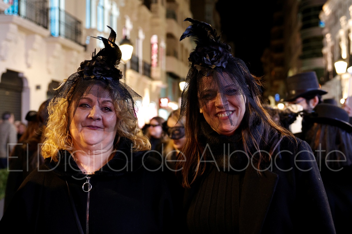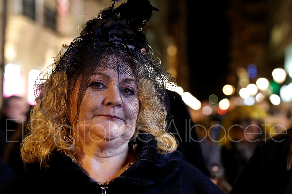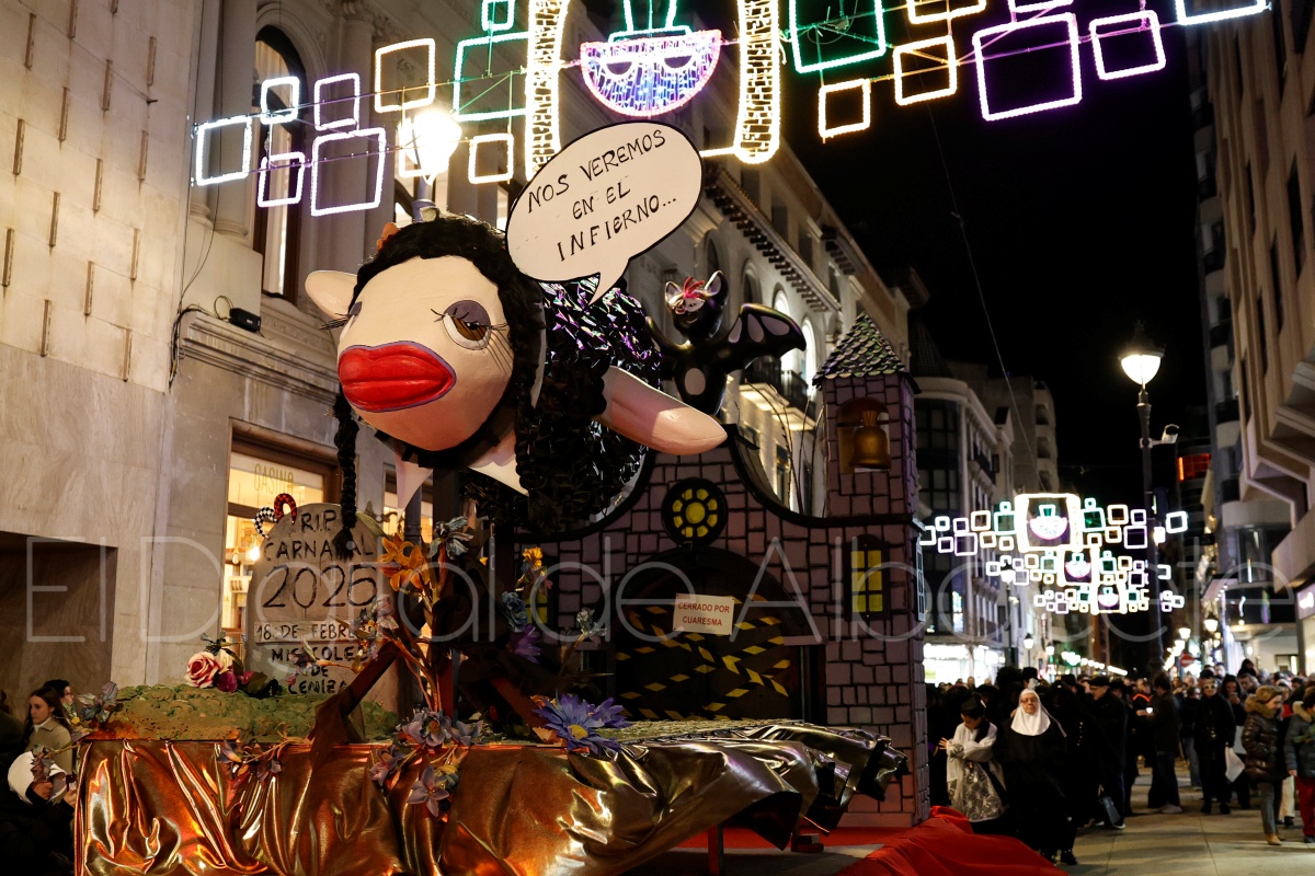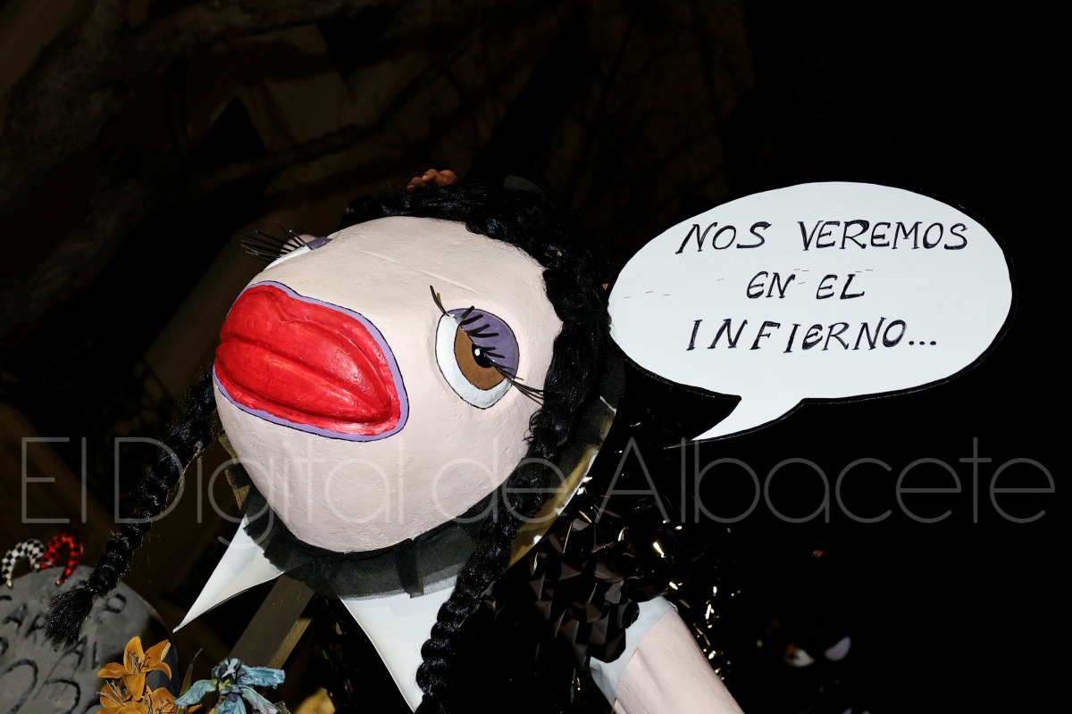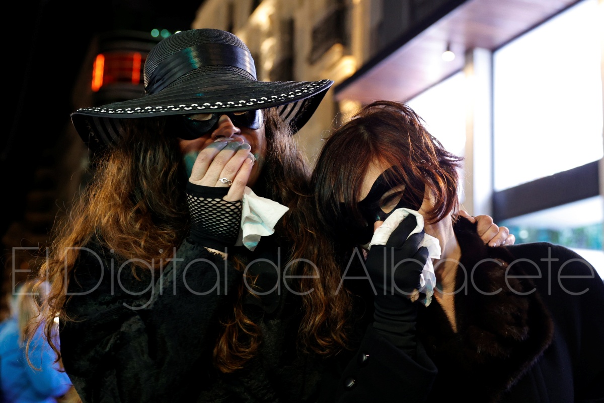 Posteriormente, al filo de las 20:30 horas, el cortejo recorría las céntricas calles Tesifonte Gallego y Marqués de Molins. De riguroso luto y compungidos por el Entierro la Sardina, los participantes se dirigían hasta la Plaza del Altozano, donde se celebrará el juicio, sentencia y quema de Doña Sardina, a cargo de la Compañía La Brava.