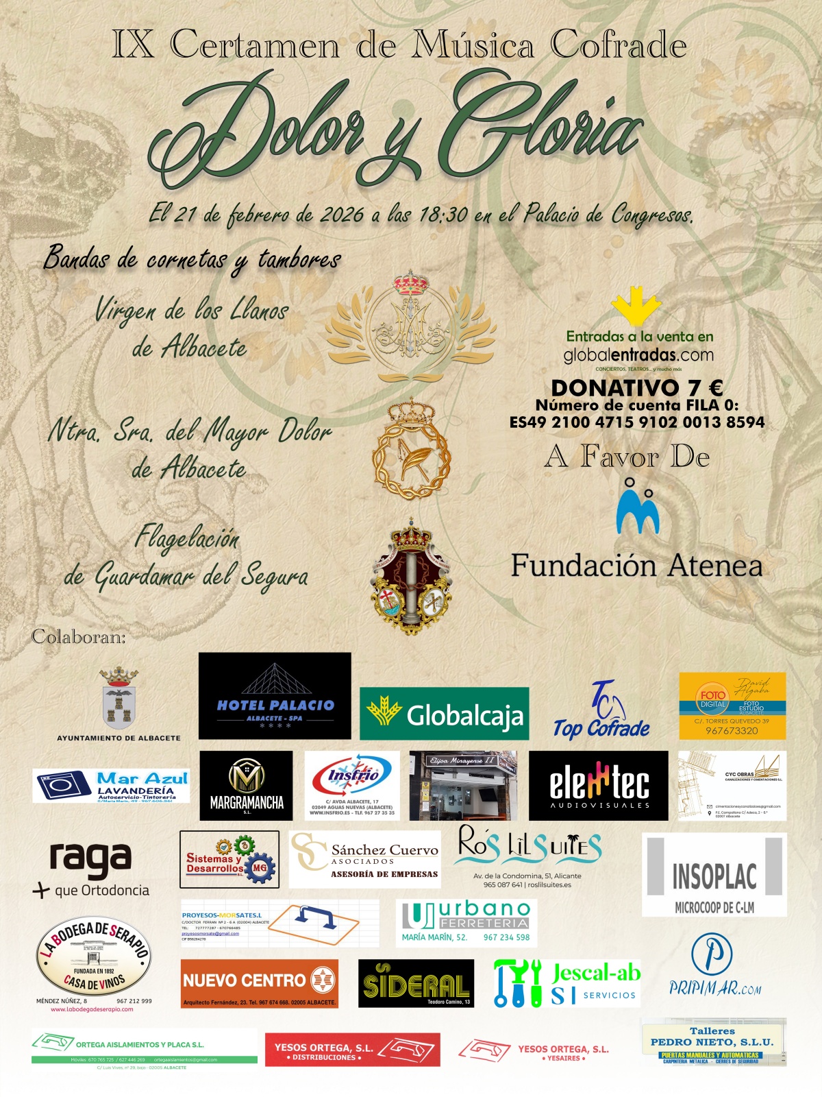 Este 21 de febrero el Hotel Palacio acogerá la celebración del XI Certamen de Música Cofrade ‘Dolor y Gloria’. Una cita cofrade a la que pondrá música la Banda de Cornetas y Tambores Virgen de Los Llanos de Albacete, la Banda de Cornetas y Tambores de Nuestra Señora del Mayor dolo de Albacete y la Banda de Cornetas y Tambores Flagelación de Guardamar del Segura (Alicante). Es certamen de música cofrade además tiene una vertiente solidaria, ya que todo lo recaudado irá destinado a la Fundación Atenea.