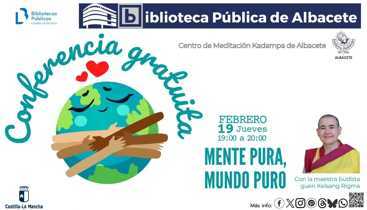 Este jueves, 19 de febrero, de 19:00 a 20:00 horas, el Centro de Meditación Kadampa Albacete organiza en la Biblioteca Pública de Albacete la conferencia ‘Mente Pura, Mundo Puro’, impartida por la maestra budista Guen Kelsang Rigma. Una propuesta para aprender a cultivar una mente positiva y transformar la manera en que percibimos nuestro entorno. A través de esta actividad gratuita los asistentes aprenderán técnicas para purificar la mente, promoviendo la calma, la satisfacción y una visión más positiva de la vida.
