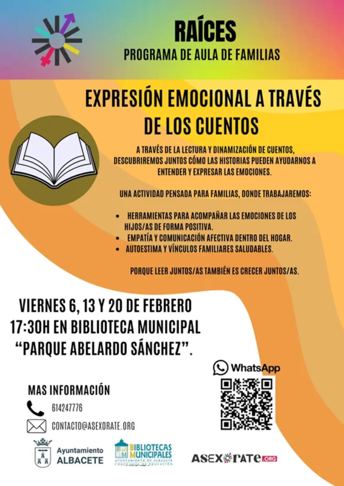 Una actividad programada desde el Programa de Crecimiento Familiar-Aula de Familias y dirigida a niños de 3 a 9 años. La de este 20 de febrero será última de estas sesiones que continuarán los días 16 y 30 de enero, en las que se abordarán el acompañamiento emocional en la infancia, la empatía y comunicación afectiva en el hogar y la autoestima y vínculos familiares saludables. Se trata de una actividad completamente gratuita pudiendo formalizar las inscripciones a través del teléfono 614247776 o en el correo [email protected]
