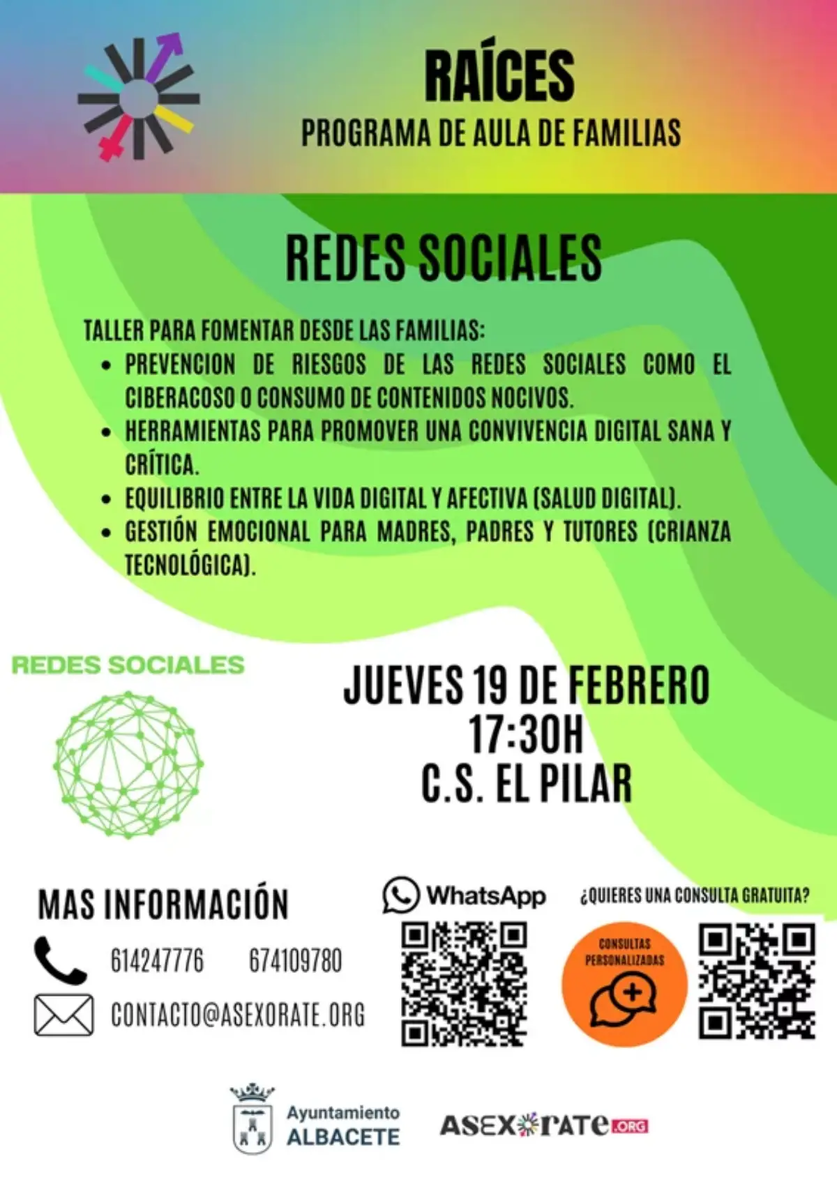 El Centro Sociocultural del Barrio El Pilar acogerá a partir de las 17:30 horas de este 19 de febrero el taller para familias: ‘Redes sociales y crianza’, de la mano de Asexórate y enmarcado en el Programa de aula de familias ‘Raíces’ promovido por el Ayuntamiento de Albacete. Un espacio práctico y cercano para aprender, reflexionar y compartir herramientas que ayuden a acompañar a las familias albaceteñas en el entorno digital con seguridad y crianza.