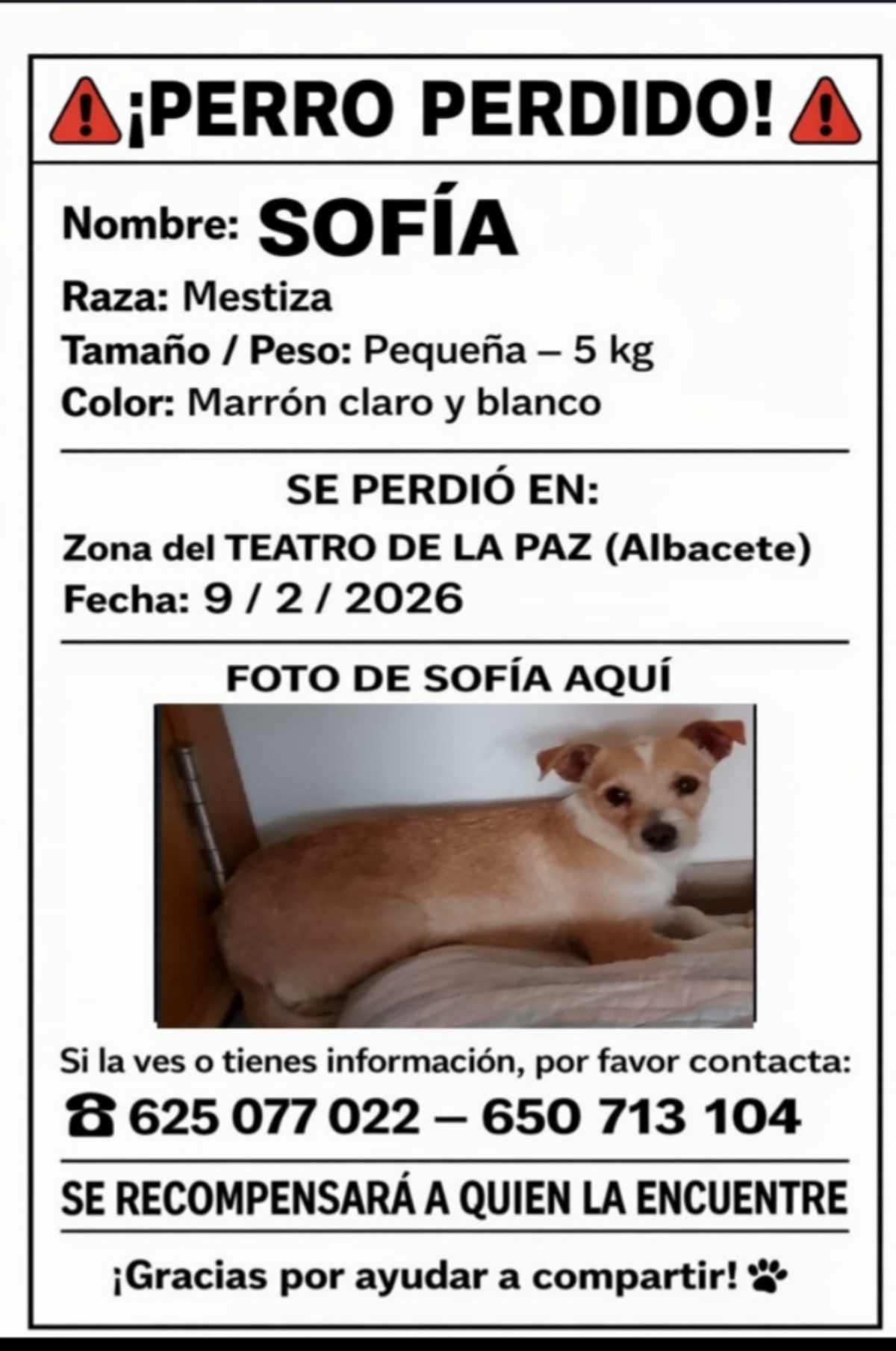 La protectora Rescatados en Adopción de Albacete ha activado un llamamiento urgente para localizar a Sofía, una perrita mestiza de pequeño tamaño desaparecida el pasado 9 de febrero en la zona del Teatro de la Paz, en la capital albaceteña.