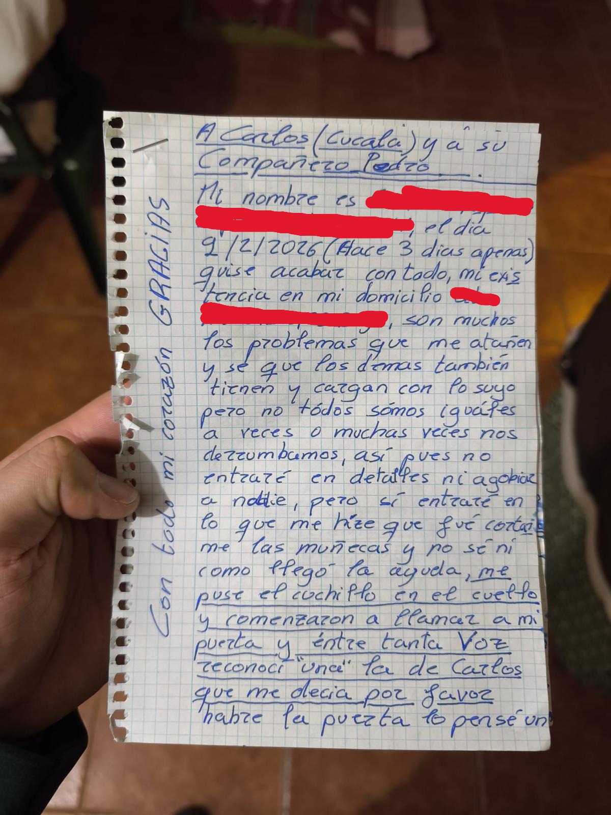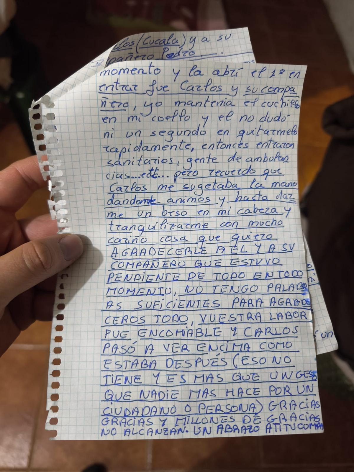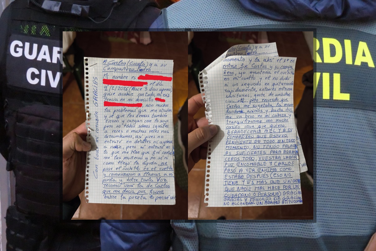 Según relata la propia mujer en una carta manuscrita remitida posteriormente, el factor humano fue clave en el desenlace. “Entre tanta voz reconocí una, la de Carlos, que me decía por favor abre la puerta”, explica en el escrito. Tras acceder al domicilio, el agente Cucala se abalanzó sobre el arma para neutralizar la amenaza, una actuación que, según AUGC, supuso un riesgo evidente para su propia integridad física.