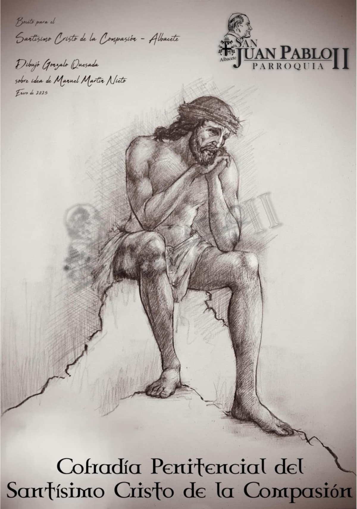 Según muestra el boceto, la imagen titular de esta nueva cofradía albaceteña será un Cristo sedente, es decir, una representación escultórica en la que Jesucristo aparece sentado, en actitud de recogimiento, meditación y espera. Se trata de una talla que muestra a Cristo con gesto sereno, sentado sobre una roca antes de la Crucifixión, en un momento de pausa dentro del relato de la Pasión. Una iconografía que busca acentuar la dimensión humana y emocional de Cristo, favoreciendo la contemplación de los fieles.