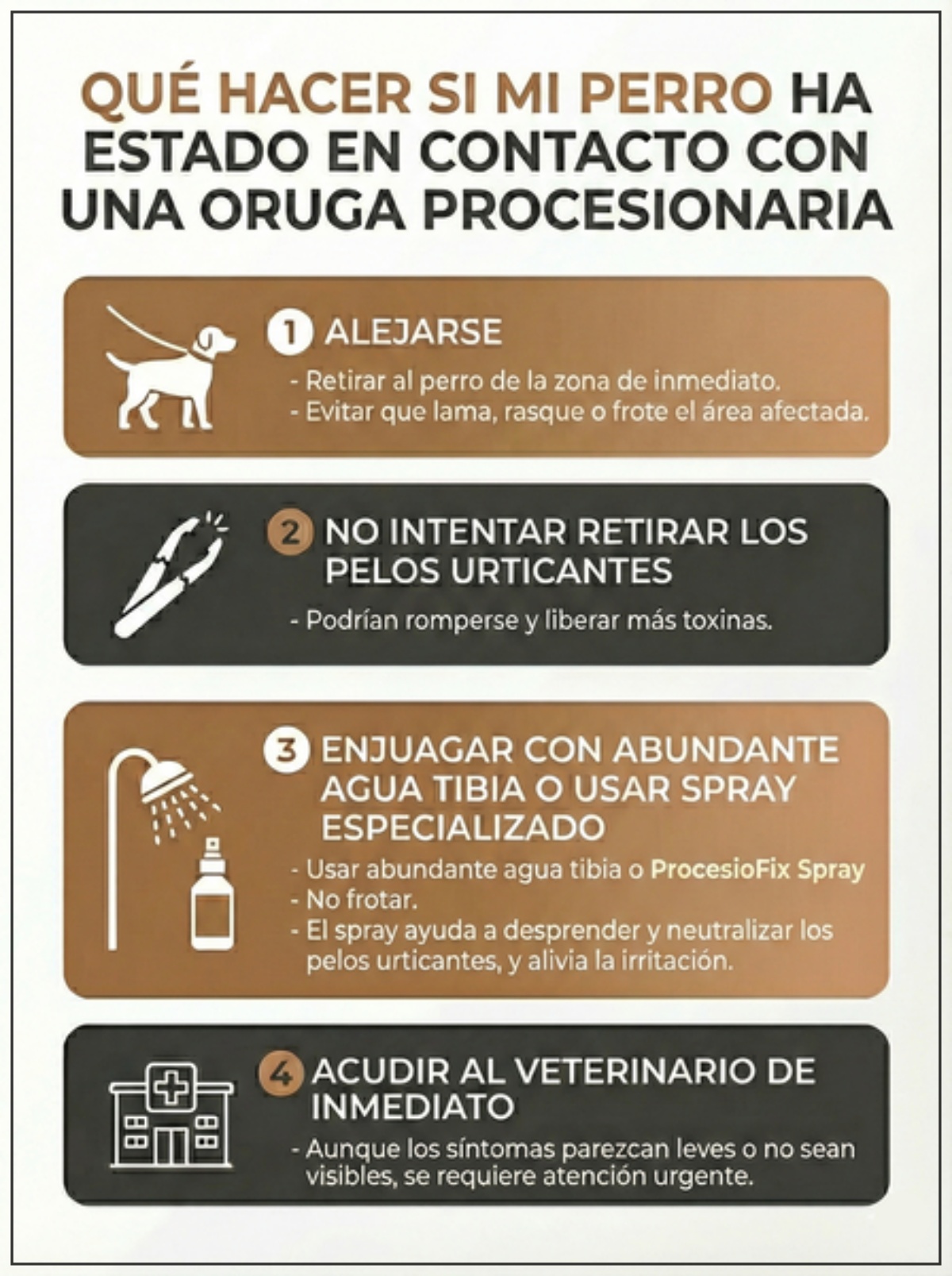El problema no radica únicamente en el contacto inicial, sino en cómo se actúa durante los primeros minutos. Según una encuesta realizada a más de 1.000 personas por la empresa Silverwoof, el 68% reconoce que no sabría cómo actuar si su perro entra en contacto con una procesionaria. Además, el 71% admite desconocer los efectos reales de la picadura. El error más frecuente es frotar la zona afectada.