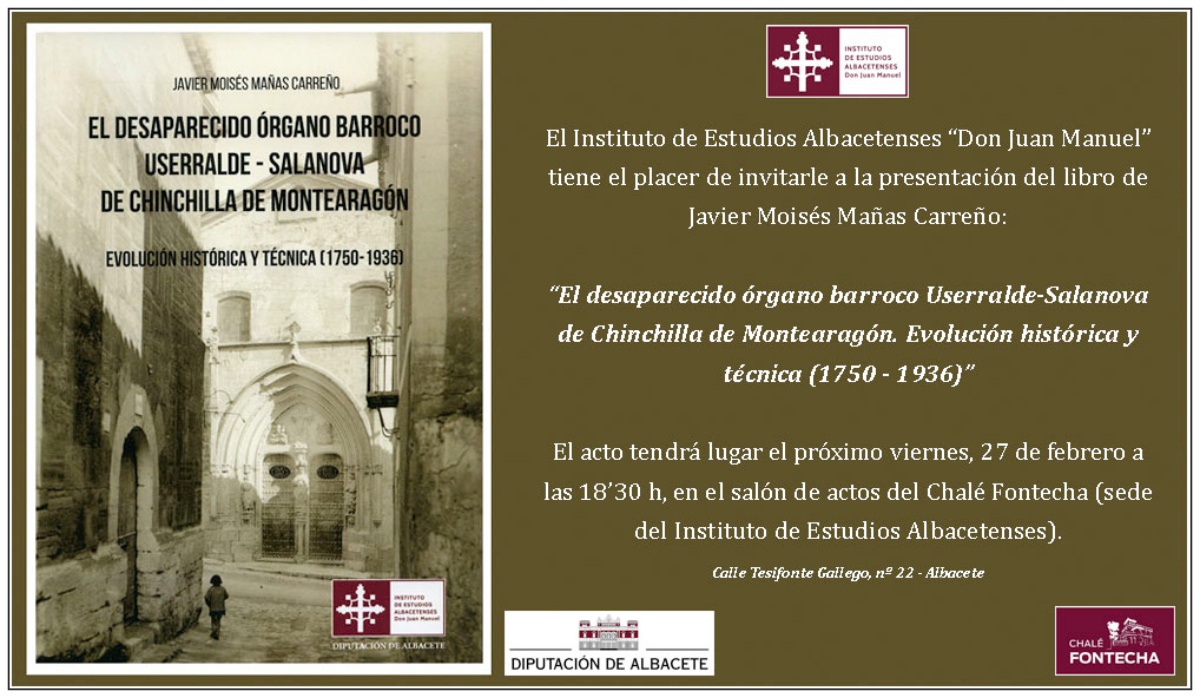 El Instituto de Estudios Albacetenses (IEA) ‘Don Juan Manuel’ de la Diputación de Albacete, celebrará este viernes, 27 de febrero, a las 18:30 horas, en el Chalé Fontecha, la presentación del libro ‘El desaparecido órgano barroco Userralde-Salanova de Chinchilla de Montearagón. Evolución histórica y técnica (1750-1936)’, del investigador y músico Javier Moisés Mañas Carreño y editado por el propio IEA.