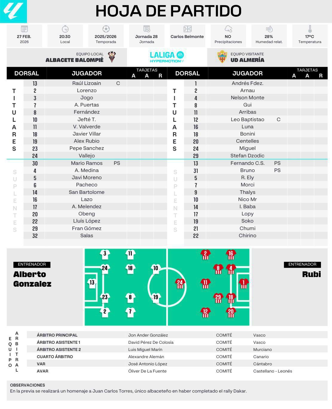 Puntual a las 20.30 horas y después del homenaje a Juan Carlos Torres tras ser el primer albaceteño en completar el Rally Dakar, González Esteban hizo sonar su silbato y el balón echó a rodar en el Carlos Belmonte, haciéndolo con un Albacete que le cedió el balón al Almería y que trató de salir rápido al contragolpe, nada nuevo bajo el sol.