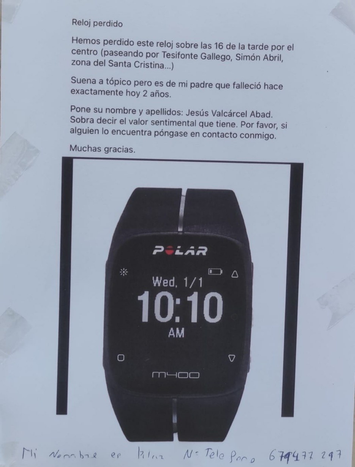 El reloj, como indica Pilar, lleva en la pantalla “el nombre de mi marido: Jesús Valcárcel”, y señala que lo perdió este jueves “sobre las 16 horas”. Desde que se dio cuenta de que lo había extraviado, Pilar no ha parado de buscarlo, incluso pegando carteles en las calles y difundiéndolo a través de redes sociales. «Estoy dispuesta a dar recompensa», sostiene.