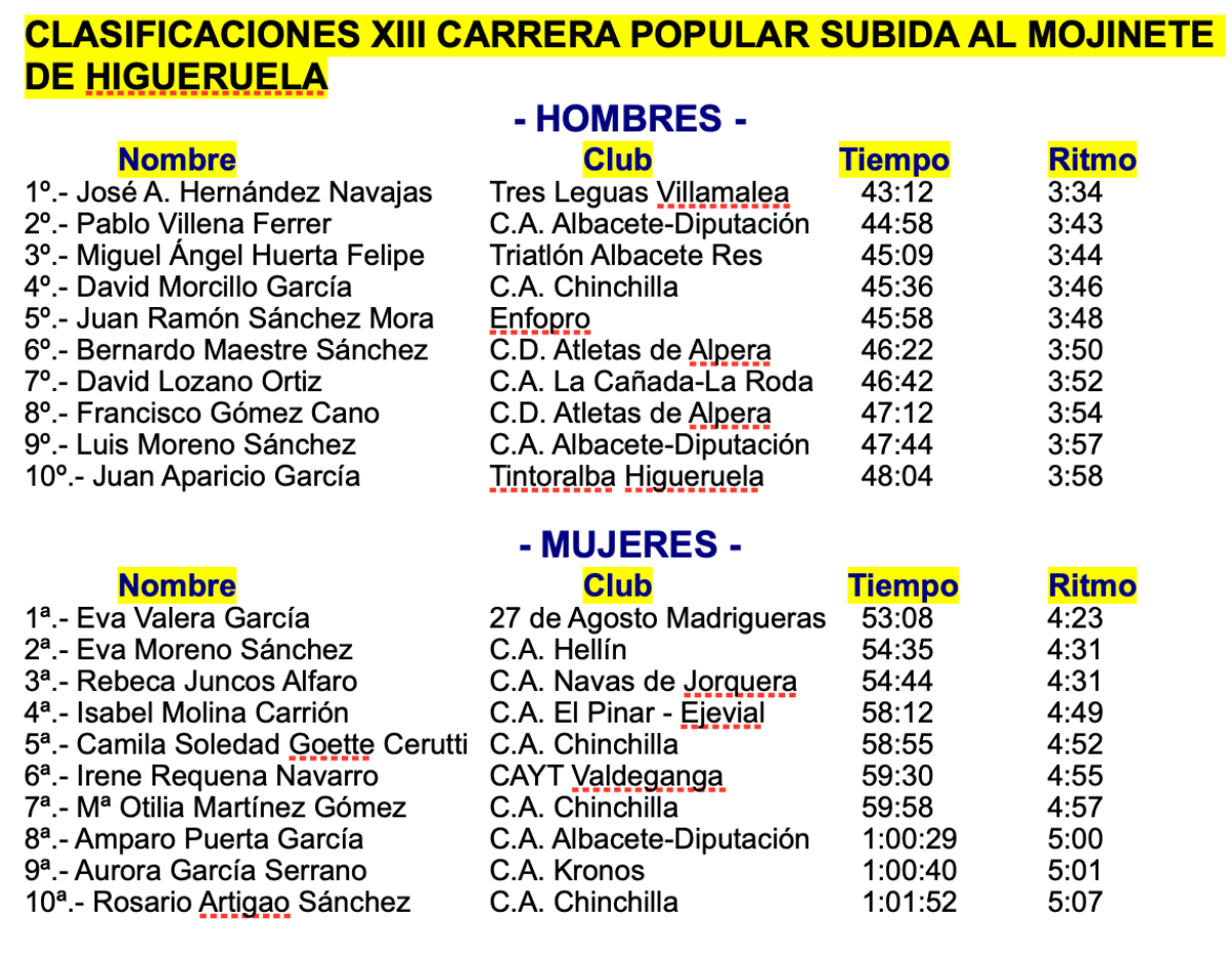 Tanto Hernández Navajas como Valera rebajaron el tiempo de la prueba del año pasado, en una mañana que contó con la presencia de Fran Valera, vicepresidente de la Diputación y natural de esta localidad, y de Daniel Sancha, diputado de Deportes, que además participó como corredor. El Club de Atletismo Kronos fue el equipo más numeroso en Higueruela, el premio de la Hermandad de Donantes de Sangre de Albacete a la posición 71 en meta fue para Rebeca Juncos Alfaro (C.A. Navas de Jorquera) y el vale de Studio Pilates Nieves Azaña se lo llevó Camila Soledad Goette Cerutti (C.A. Chinchilla), primera clasificada de la categoría Senior Femenina.