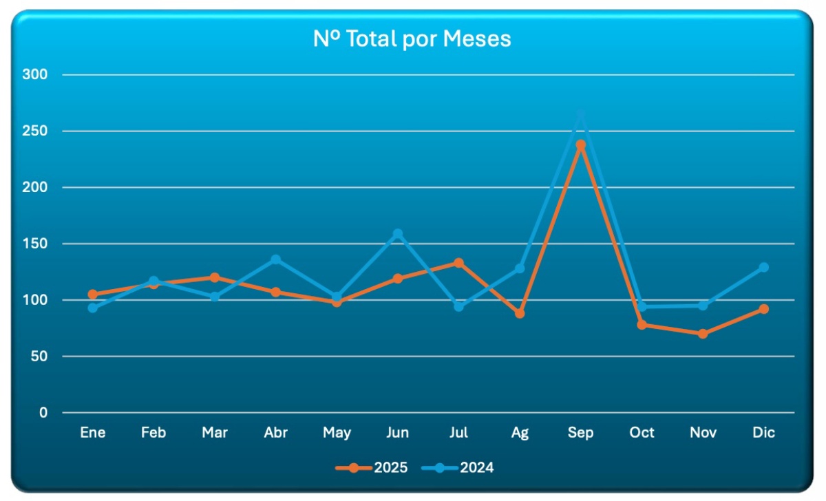 La evolución mensual apunta a un 2025 más contenido que 2024. En el acumulado por meses, 2024 marcó picos destacados como junio (56) y febrero (50), mientras que 2025 se mueve en registros algo inferiores, con máximos en junio (47) y febrero (44).