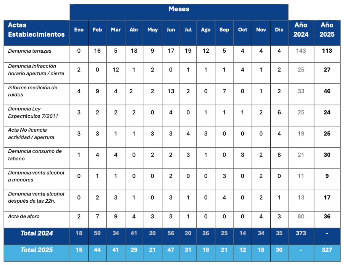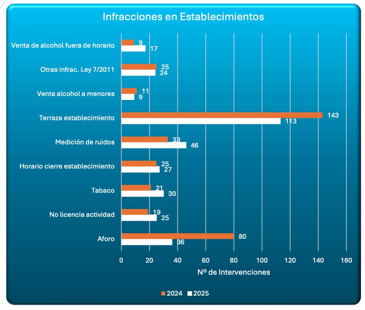 Aún más acusado es el descenso en actas por aforo: pasan de 80 en 2024 a 36 en 2025, lo que supone una caída del 55%. También retroceden las infracciones por venta de alcohol a menores, con 9 denuncias en 2025 frente a 11 el año anterior (-18,18%), y las vinculadas a la Ley de Espectáculos 7/2011, que bajan ligeramente de 25 a 24 (-4%).