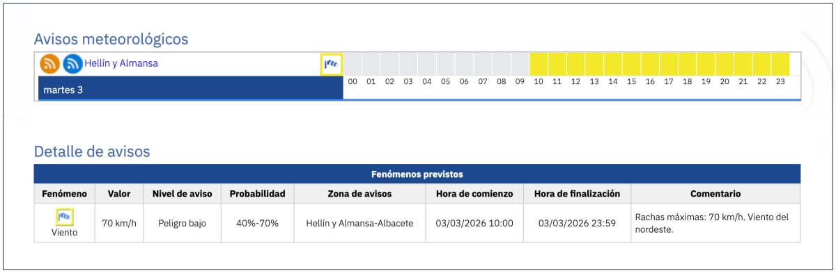 Parte de la provincia de Albacete, concretamente las zonas de Hellín y Almansa, así como otras más cercanas a la capital, están este martes en aviso amarillo por inclemencias meteorológicas. Concretamente, lo están por la probabilidad de fuertes vientos.