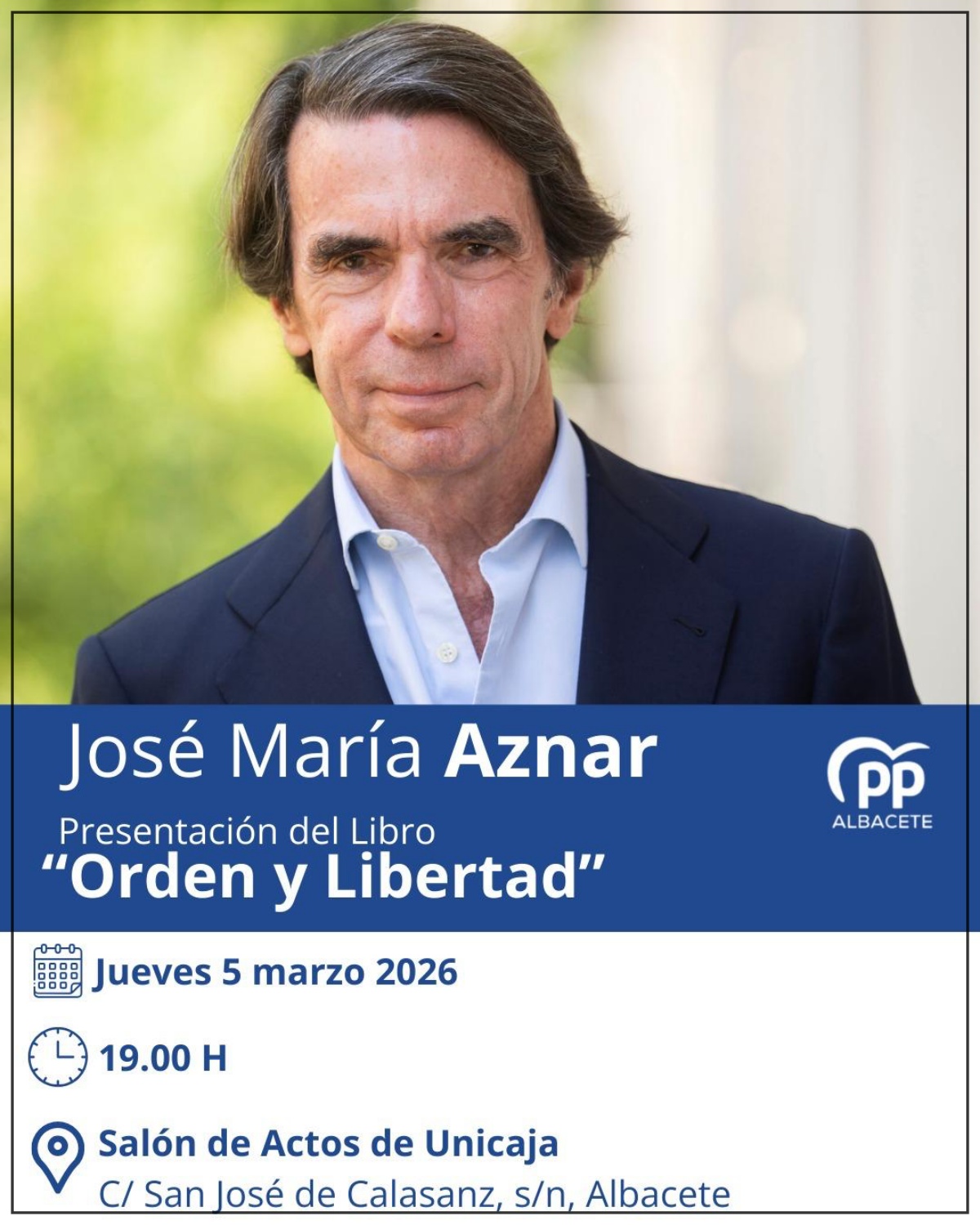 El próximo jueves, 5 de marzo, Albacete acogerá la presentación del libro “Orden y Libertad” del expresidente del Gobierno de España, José María Aznar. El acto tendrá lugar a las 19.00 horas en el Salón de Actos de Unicaja, situado en la calle San José Calasanz.