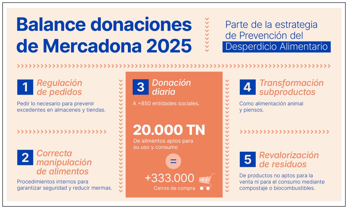 Mercadona cuenta con diversas estrategias de prevención del desperdicio alimentario, entre las que destaca la donación diaria de alimentos aptos para el consumo. A través de esta medida, se han aprovechado 20.000 toneladas de alimentos y productos en 2025, en sus más de 1.670 tiendas y bloques logísticos de España y Portugal.