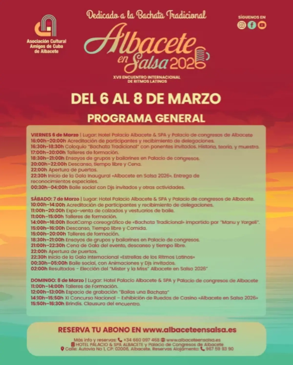 Albacete acogerá del 6 al 8 de marzo la XVII edición del Encuentro Internacional de Ritmos Latinos ‘Albacete en Salsa 2026’, organizado por la Asociación Cultural ‘Amigos de Cuba’. Una edición que estará dedicada a la bachata tradicional.