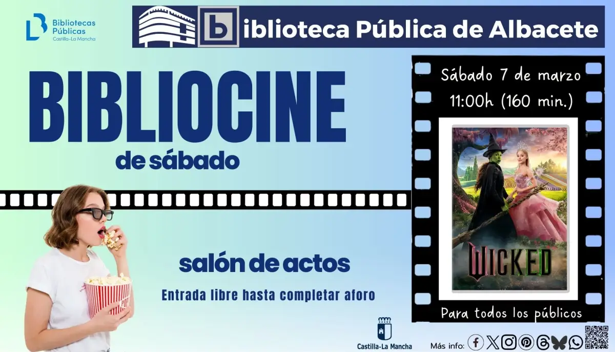En marzo continúa el Bibliocine de sábado en la Biblioteca Pública de Albacete, una cita pensada para disfrutar del mejor cine en familia en la biblioteca. El mes arrancará este 7 de marzo, a las 11:00 horas, con la proyección de la película ‘Wicked’, una espectacular historia cargada de emoción, fantasía y música.