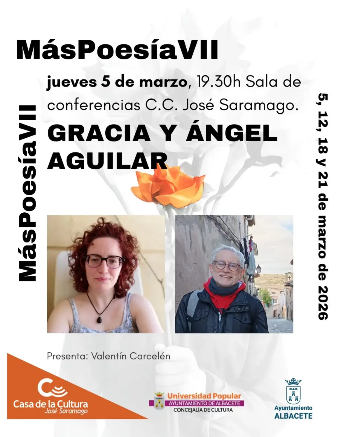 Por otra parte, la sala de conferencias de la Casa de la Cultura José Saramago, acogerá también este jueves, a partir de las 19:30 horas, una conferencia enmarcada en el ciclo Más Poesía VII. En concreto, está previsto que compartan su voz Gracia Aguilar Almendros y Ángel Javier Aguilar Bañón. Así, cabe recordar que Más Poesía es un dispositivo cultural que activa la ciudad desde la palabra y sitúa la poesía en el centro de la programación pública contemporánea.