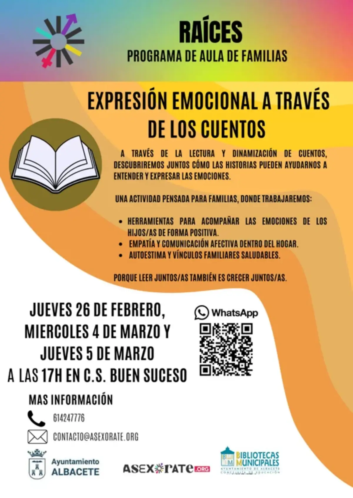 Dentro del Programa de Crianza Positiva y Bienestar Familiar-Raíces se enmarca esta iniciativa que nace como espacio para leer, compartir y crecer en familia. A través de la lectura y la dinamización de cuentos los asistentes aprenderán a acompañar las emociones de forma positiva, fomentar la empatía y la comunicación afectiva y a fortalecer la autoestima y los vínculos familiares.