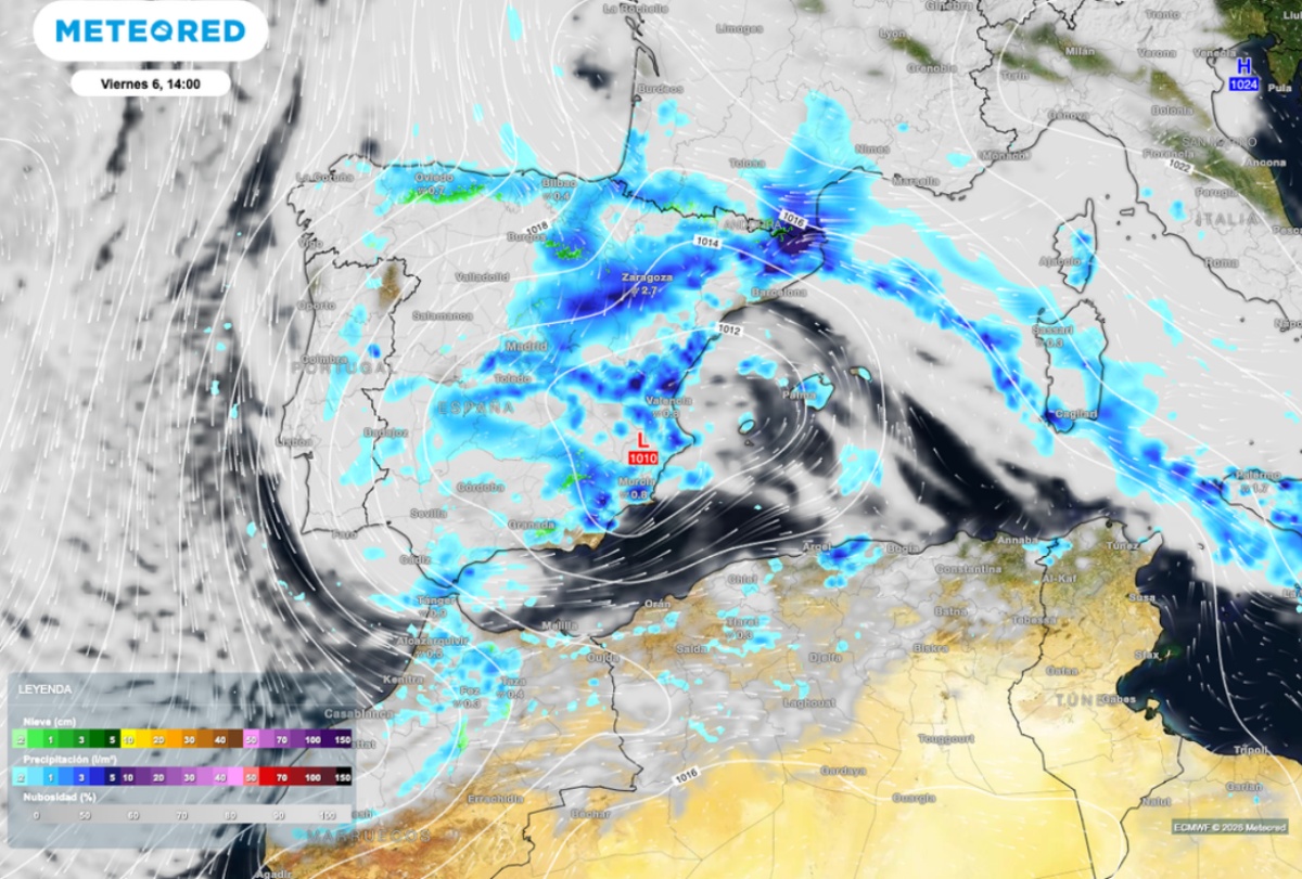 El sábado se esperan precipitaciones en amplias áreas de la Península, especialmente en Galicia, el Cantábrico, Cataluña y el norte de la Comunidad Valenciana, donde podrían ser localmente fuertes y venir acompañadas de tormenta. También continuará la nieve en los sistemas montañosos, con cotas entre los 1.300 y los 1.500 metros.