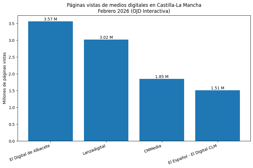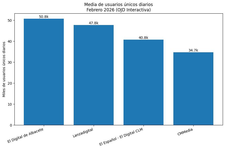El Digital de Albacete se consolida como el medio de comunicación digital con mayor audiencia en Castilla-La Mancha tras encabezar el ranking de tráfico de febrero de 2026 tanto en visitas totales como en media de usuarios únicos diarios, según los datos auditados por la Oficina de Justificación de la Difusión (OJD Interactiva).