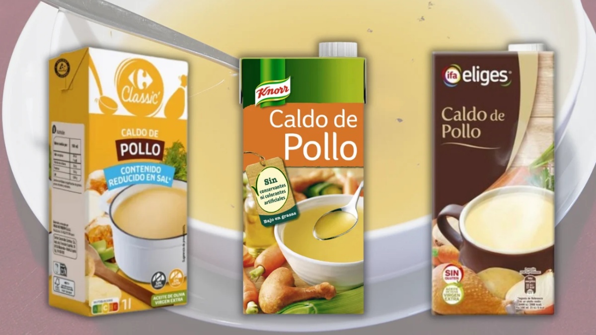 El informe también analiza caldos comercializados como “caldo de pollo con jamón”. Según la asociación, el porcentaje de este ingrediente es muy reducido en todos los casos examinados.
