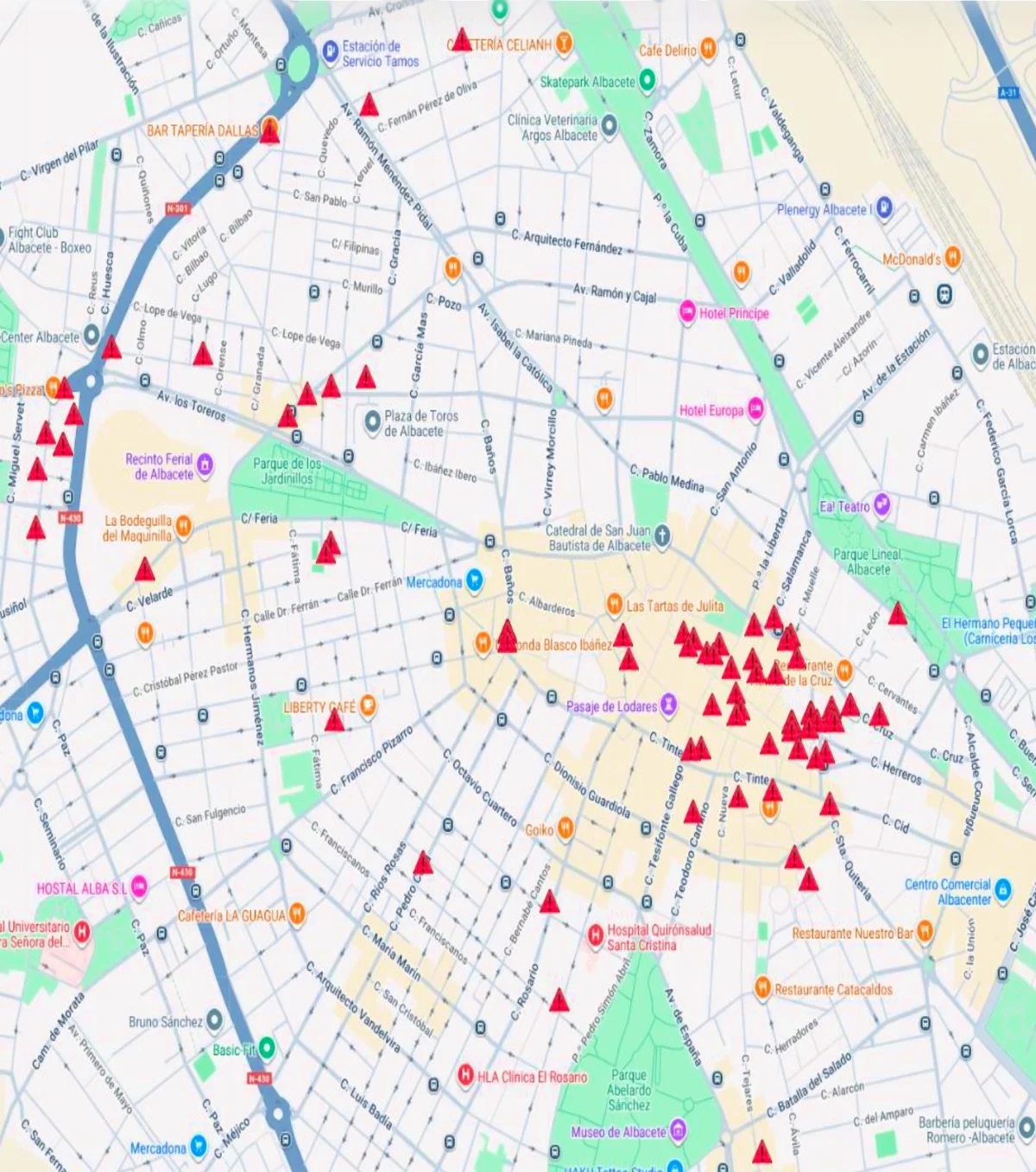 El mapa aportado sobre estas intervenciones refuerza la lectura de los datos y muestra una notable concentración de puntos en la zona centro de la ciudad, especialmente en el entorno del casco urbano más transitado y de áreas de ocio, aunque también aparecen incidencias repartidas en otros barrios y ejes urbanos de Albacete. La distribución evidencia que el fenómeno no se limita a un único enclave, aunque sí presenta focos especialmente intensos en determinadas áreas.