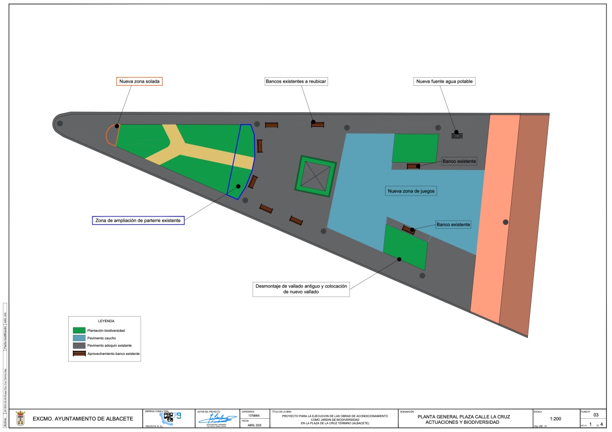 Los 1.071 metros cuadrados del solar tendrán zonas verdes, áreas de juego infantil y zonas de juegos de agua, incluyendo itinerarios peatonales accesibles con pasos pavimentados con adoquín. Los parterres ajardinados, que ocuparán 400 metros cuadrados, se harán con tierra vegetal, plantación de arbustivas y arbolado de sombra. Habrá una zona de juegos infantiles de 160 metros cuadrados, con pavimento de seguridad de caucho y juegos inclusivos, para diferentes rangos de edad.