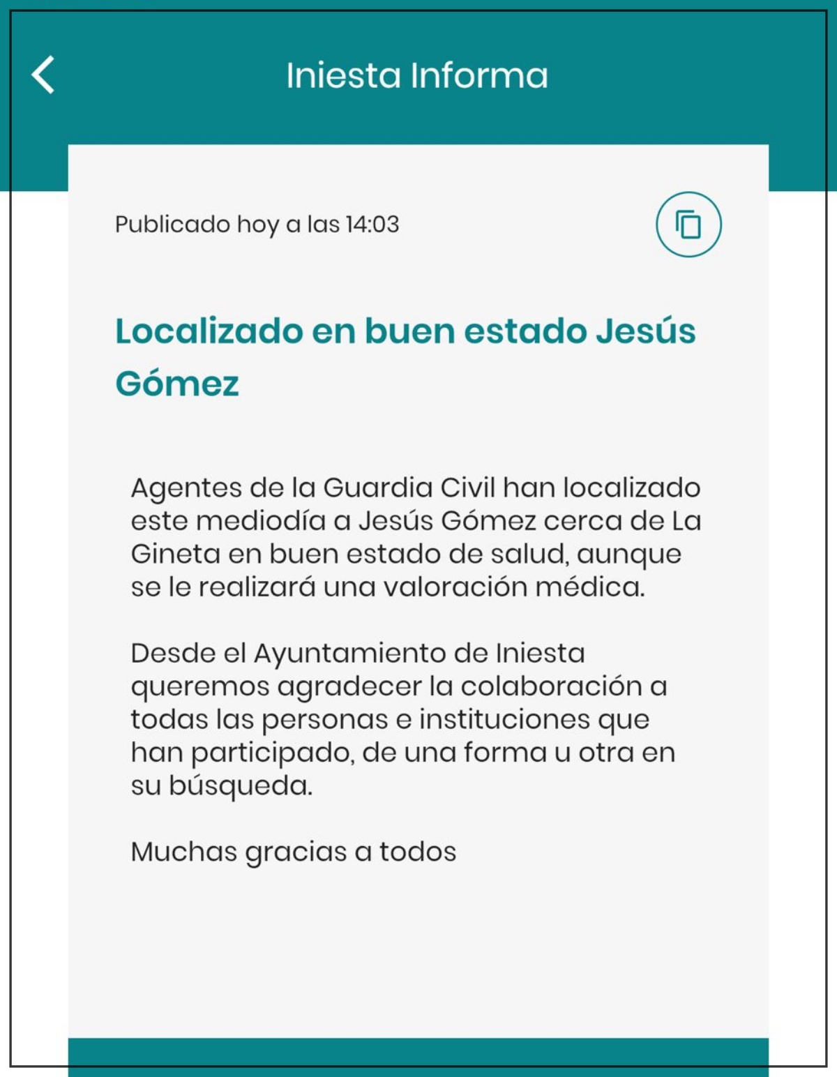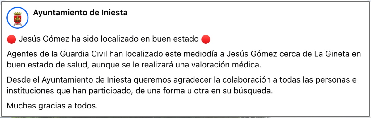 Jesús Gómez, vecino de Iniesta, había sido buscado de forma intensa durante todo el fin de semana después de que familiares, amigos y cuerpos de emergencias alertaran de su desaparición. El caso había generado una gran preocupación tanto en su localidad natal como en la provincia de Albacete, al no conocerse su paradero desde la mañana del sábado.
