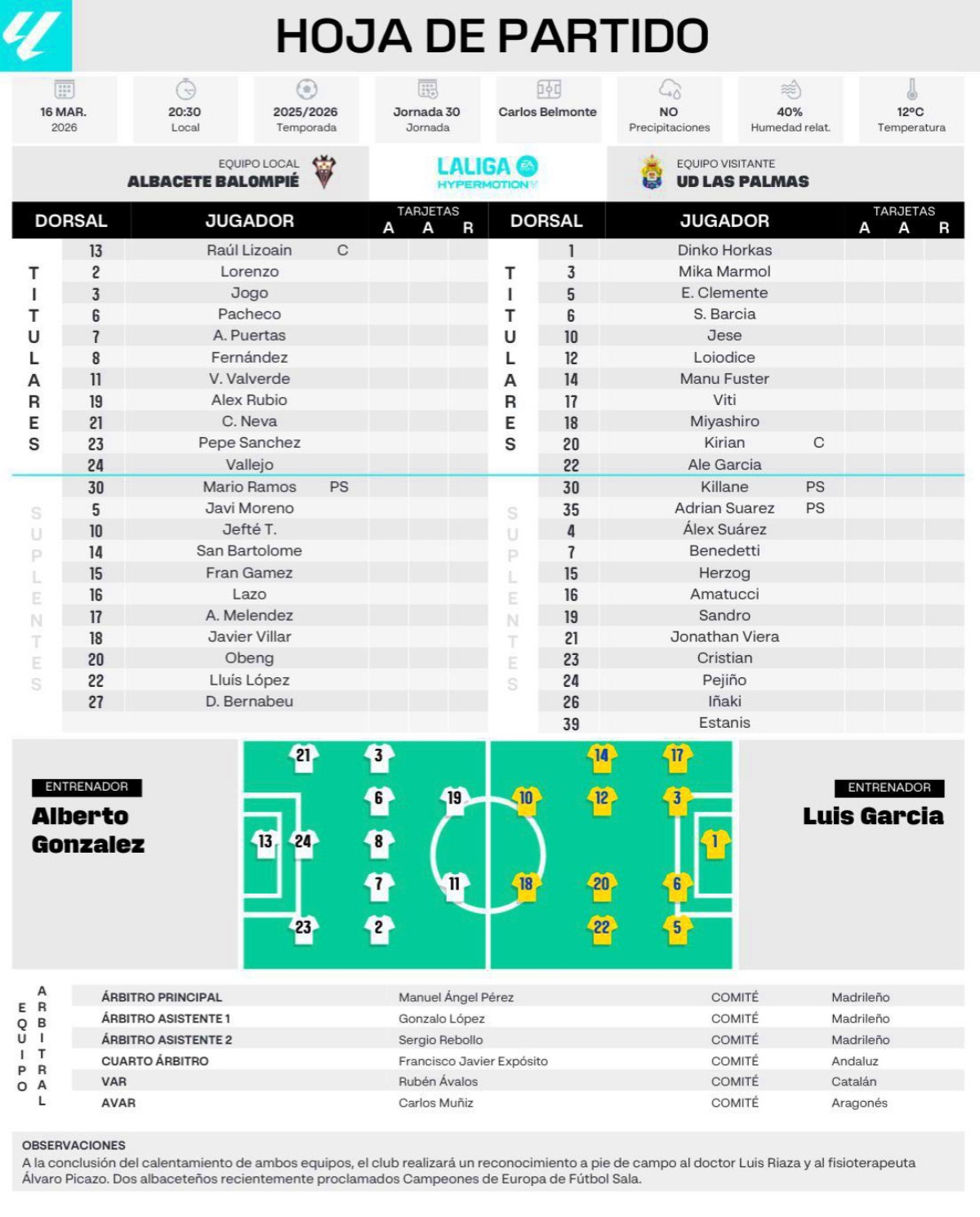 Mario (PS), Dani Bernabéu, Luis López, Javi Moreno, Fran Gámez, Ale Meléndez, Javi Villar, José Carlos Lazo, Samu Obeng San Bartolomé, y Jefté comenzaron el partido en el banquillo junto a Alberto González esperando su oportunidad desde la suplencia.