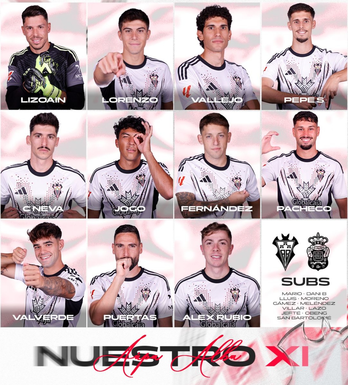 El Albacete sale de inicio ante la UD Las Palmas con Raúl Lizoain; Lorenzo, Vallejo, Pepe Sánchez y Carlos Neva; Jogo, Fernández y Antonio Pacheco; Víctor Valverde, Antonio Puertas y Álex Rubio. Jefté, mientras tanto, espera su turno desde el banquillo, junto a Mario, Dani B, Luis Moreno, Fran Gámez, Ale Meléndez, Javi Villar, José Carlos Lazo, Obeng y San Bartolomé.