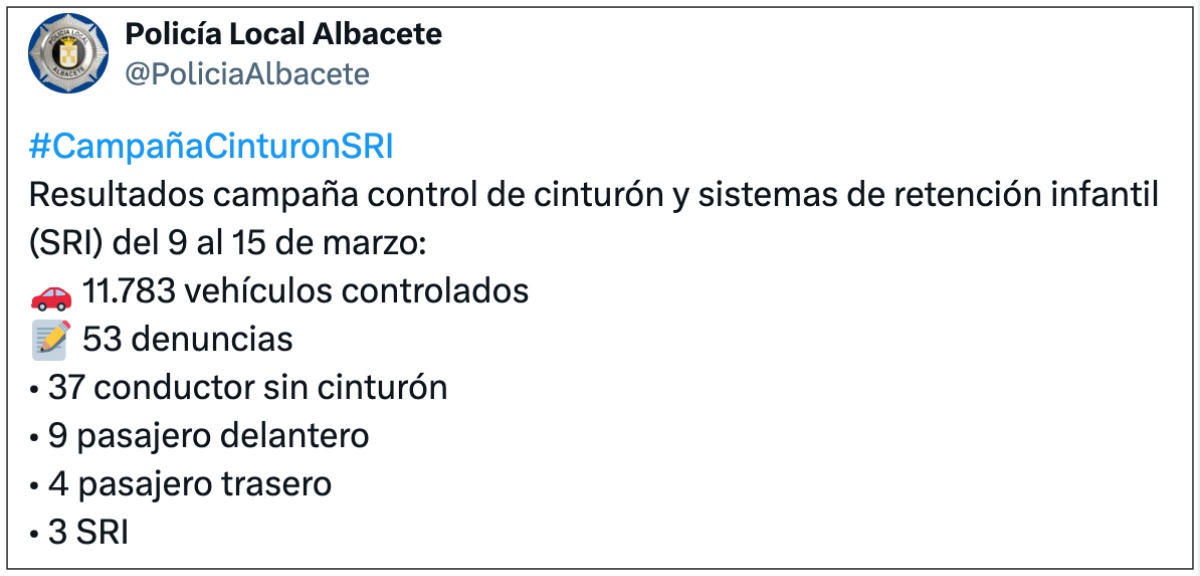 Así las cosas, la Policía Local de Albacete ha hecho públicos los resultados de la campaña especial de vigilancia sobre el uso del cinturón de seguridad y de los sistemas de retención infantil (SRI), desarrollada entre los días 9 y 15 de marzo, y el balance vuelve a conectar con uno de los lemas más recordados de la concienciación vial en España: “Abróchate a la vida”.