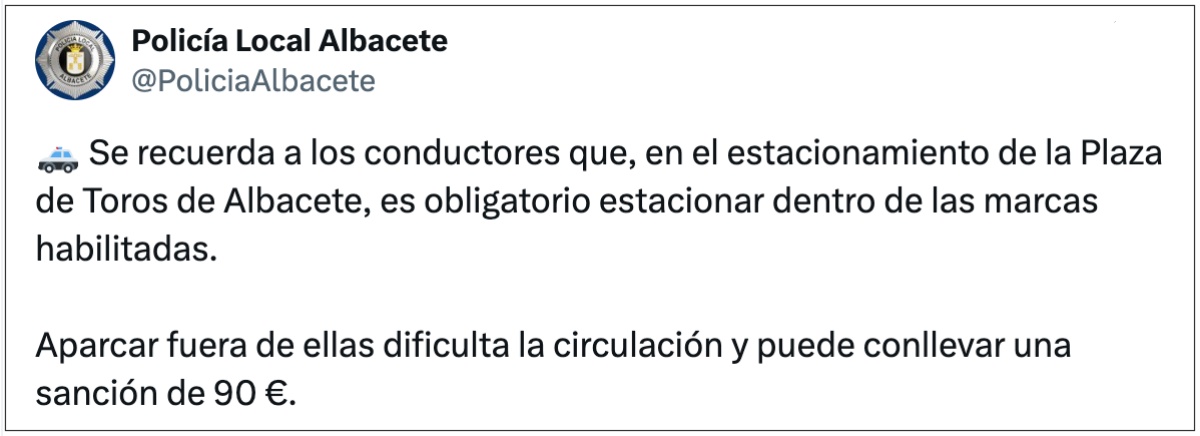 En su mensaje, la Policía Local ha señalado textualmente: “Se recuerda a los conductores que, en el estacionamiento de la Plaza de Toros de Albacete, es obligatorio estacionar dentro de las marcas habilitadas. Aparcar fuera de ellas dificulta la circulación y puede conllevar una sanción de 90 €”.