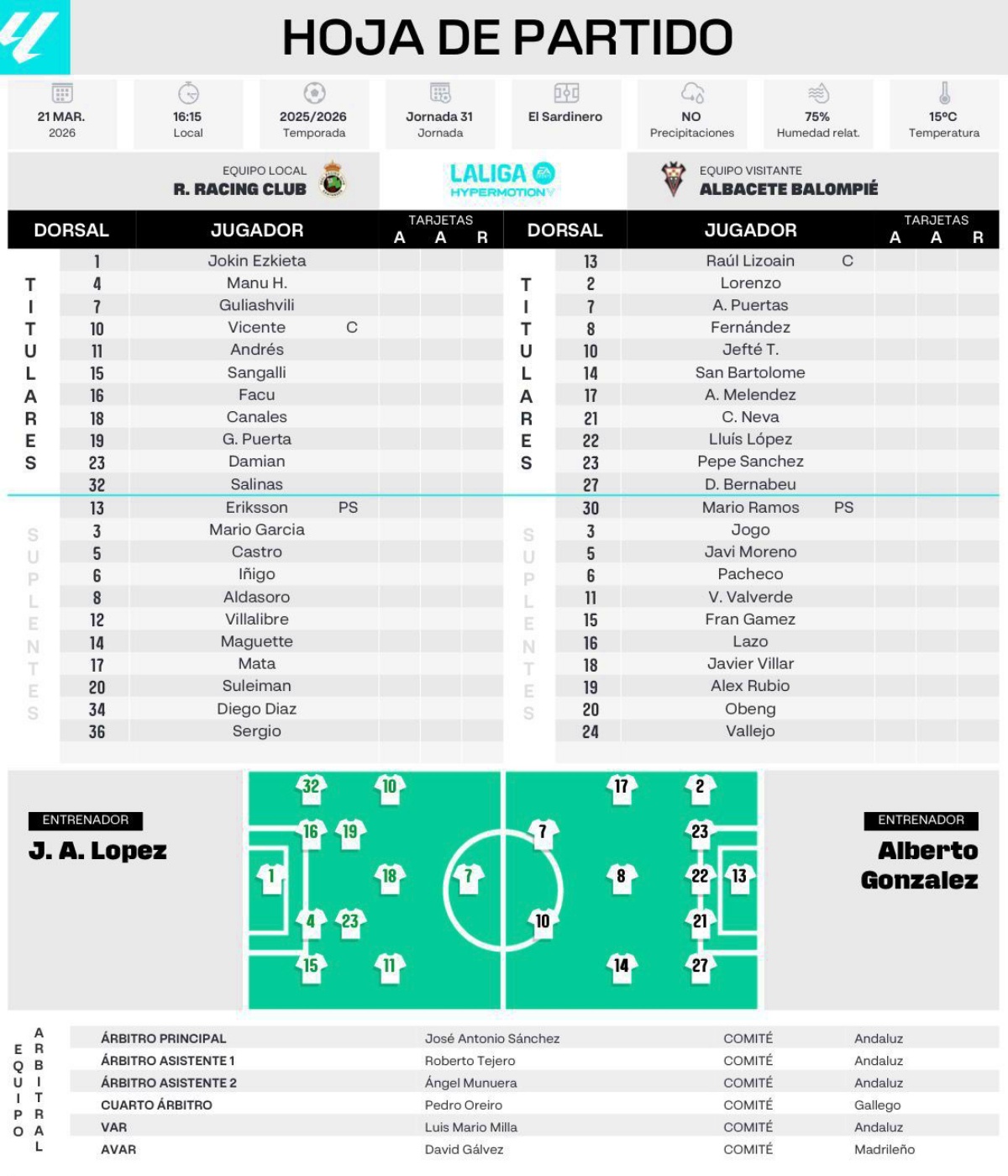 En lo que se refiere al Racing de Santander, en el banquillo de al lado, otro Alberto, en este caso López y de primer nombre José, quien apostó por un once compuesto por Ezkieta; Sangali, Manu, Facu y Salinas; Damián y Puerta; Andrés, Canales y Vicente; y Guliashvili.