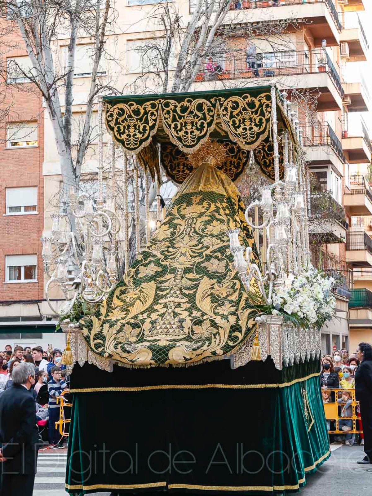 Una de las joyas textiles más espectaculares de la Semana Santa de Albacete es el manto de Nuestra Señora de la Esperanza Macarena. Se trata de “un manto único en España”, aseguraba el presidente de esta cofradía albaceteña, Arturo Cañadas. Sin duda, de las piezas más emblemáticas del bordado cofrade es el conocido ‘manto camaronero’, obra de Juan Manuel Rodríguez de Ojeda, que cada Madrugá luce la Macarena de Sevilla. Esta pieza se ha convertido en uno de los grandes referentes del arte textil de la Semana Santa, pero confesaba el propio Arturo Cañadas que desde la capital hispalense también han mostrado curiosidad por las particularidades que hacen único al manto de la Macarena de Albacete, pieza de la que aseguraba “debemos sentirnos muy orgullosos de custodiar y de poder disfrutarla en la Semana Santa de Albacete”.