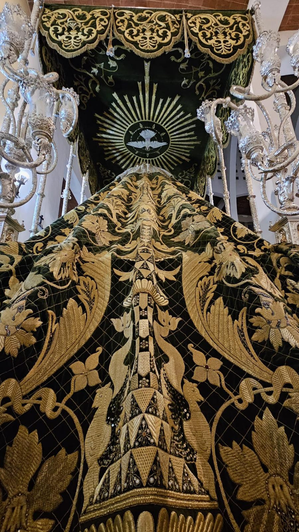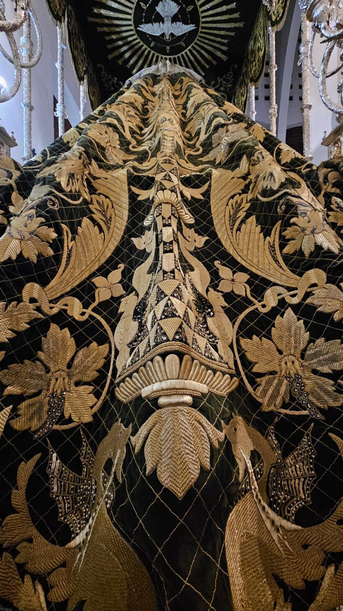 Más allá de esta dualidad entre el bien y el mal, entre los ricos bocados del manto de la Macarena se esconden detalles sorprendentes. Arturo Cañadas desatacaba, por ejemplo, la importancia del color: “hay dos dragones con la boca carmesí”, que aportan un toque de contraste. Pero los bordados no son solo ornamentales, sino que también encierran significados bíblicos. A lo largo del manto se pueden encuentran “12 triángulos diferentes que representa a las 12 tribus de Israel”, subrayaba el presidente de la Cofradía de Nuestra Señora de la Esperanza Macarena. Otra pareja de dragones corona la pieza y, según explicaba, “sujetan la bóveda celeste”, mientras que numerosos motivos florales y elementos ornamentales completan el diseño, dotando al manto de un carácter majestuoso y lleno de simbolismo.