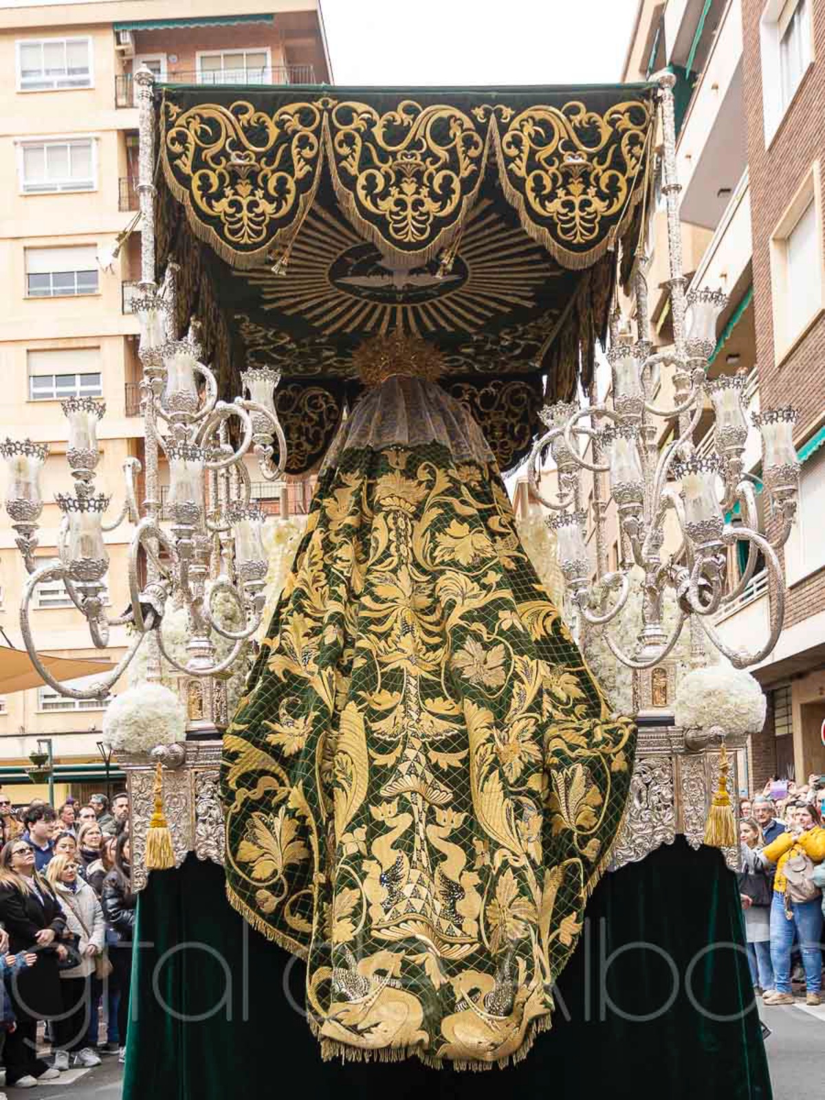 El manto de la Macarena impresiona no solo por su riqueza ornamental, sino también por sus imponentes dimensiones. La pieza textil mide 4 metros de longitud y tiene un perro aproximado de 80 kilos, lo que la convierte en una auténtica jota de la Semana Santa de Albacete. De hecho, confesaba Arturo Cañadas sobre la imponentes dimensiones de este manto que “es tan grande que extendido no cabe en la sede de nuestra cofradía”, lo que habla de la magnitud y presencia que aporta a la imagen de la Virgen.