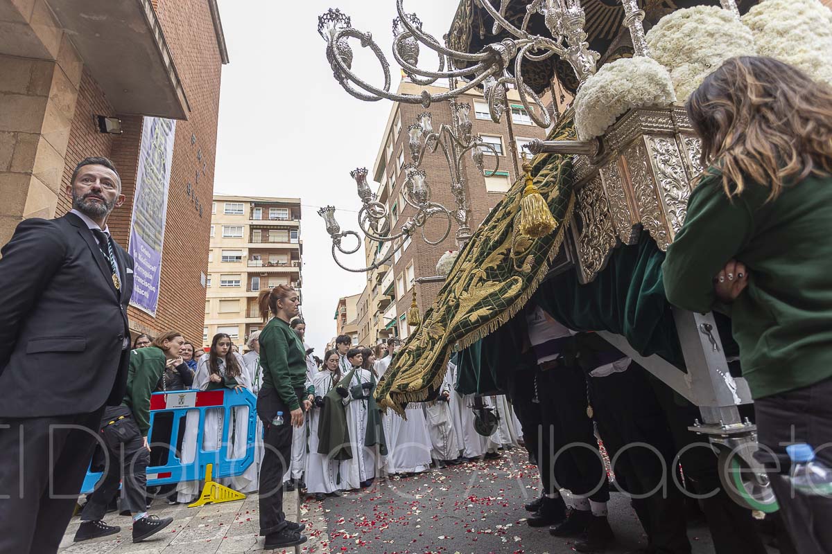 La Macarena luce este espectacular manto verde Esperanza en sus salidas procesional por las calles de Albacete cada Viernes Santo, pero también en la visita que realiza cada Sábado Santo al Cotolengo. Un manto “único en España y que no tiene que envidiarle a otros”, confesaba Arturo Cañadas, iniciando en que es muy importante protegerlo y realizar labores de conservación para que esta joya del patrimonio textil de la Semana Santa de Albacete no se deteriore. Para ello, desvelaba que durante el resto del año “lo tenemos cuidadosamente doblado con papeles para no dañar ni el tejido ni la pedrería”, añadiendo que “lo guardamos en un cajón enorme” que cuida que el paso del tiempo no dañe este valioso manto.