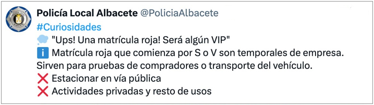 En el mensaje publicado por la Policía Local de Albacete se explica de forma directa el motivo de la infracción. “Ups! Una matrícula roja! ¿Será algún VIP?. Las matrículas rojas que comienza por S o V son temporales de empresa. Sirven para pruebas de compradores o transporte del vehículo. Está prohibido estacionar en vía pública, y están prohibidas también actividades privadas y resto de usos”, señalaron los agentes.