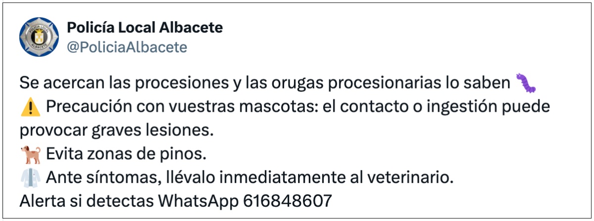 La Policía Local de Albacete ha advertido a través de sus redes sociales del riesgo que supone la oruga procesionaria para las mascotas y ha pedido precaución a los vecinos. En su mensaje señala que “el contacto o ingestión puede provocar graves lesiones”, recomienda evitar las zonas de pinos, pide acudir de inmediato al veterinario ante cualquier síntoma y solicita que, si se detecta su presencia, se comunique a través del WhatsApp 616 848 607, un canal de contacto que figura también en la información oficial del cuerpo policial.