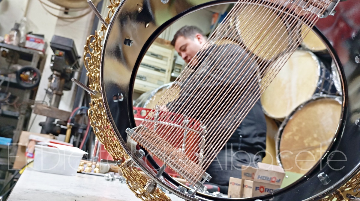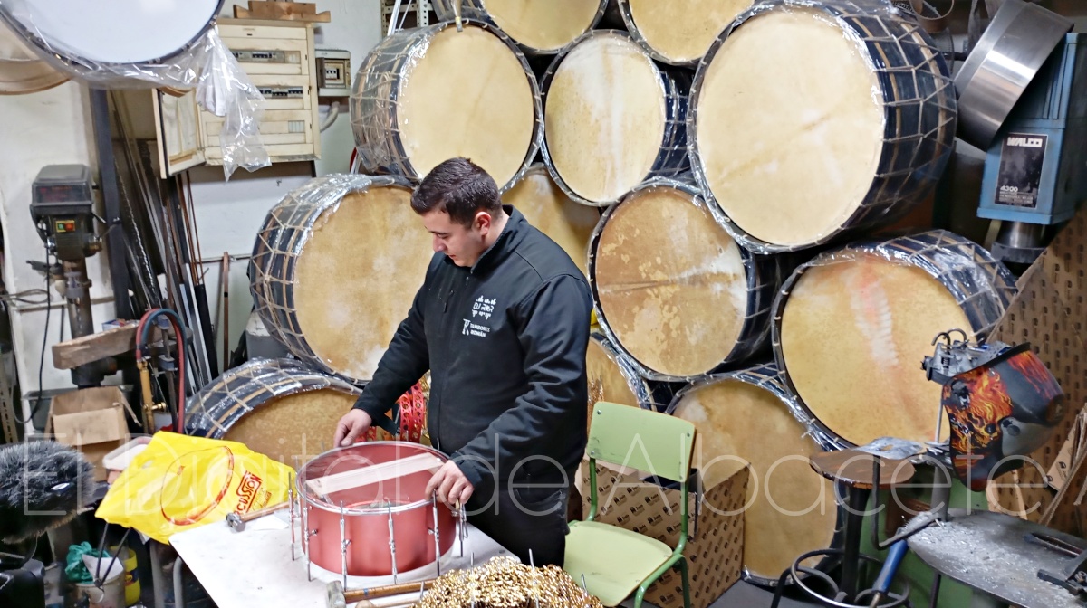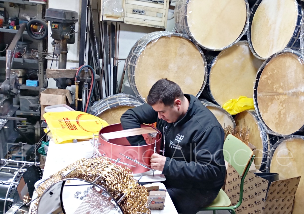 La Semana Santa de Tobarra, declarada de Interés Turístico Nacional, no se entendería sin el constante redoble de los tamborileros. De hecho, su famosa ‘Tamborada’ está declarada como Patrimonio Inmaterial de la Humanidad por la UNESCO. Empresas como ‘Tambores Román’ contribuyen a que esta tradición se mantenga, tanto creando nuevos tambores, como dedicándose a la reparación y puesta a punto de los mismos. “Estamos todo el año haciendo reparaciones, pero en estas fechas estamos desbordados porque todo el mundo quiere tener su tambor listo para Semana Santa. Hay que tener en cuenta que estos tambores tienen que estar preparados para aguantar, entre otras cosas, la ‘Tamborada’ de 104 horas seguidas del Miércoles Santo de Tobarra. Estos días tenemos de todo, gente de Tobarra de toda la vida, jóvenes que empiezan a tocar, y también personas de fuera que conocen la tradición y quieren un buen tambor. Incluso hay clientes que vienen expresamente buscando ese sonido característico de aquí”, detalla.