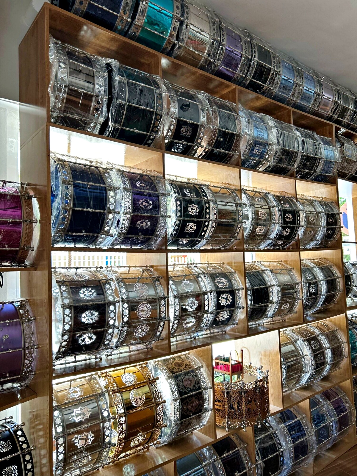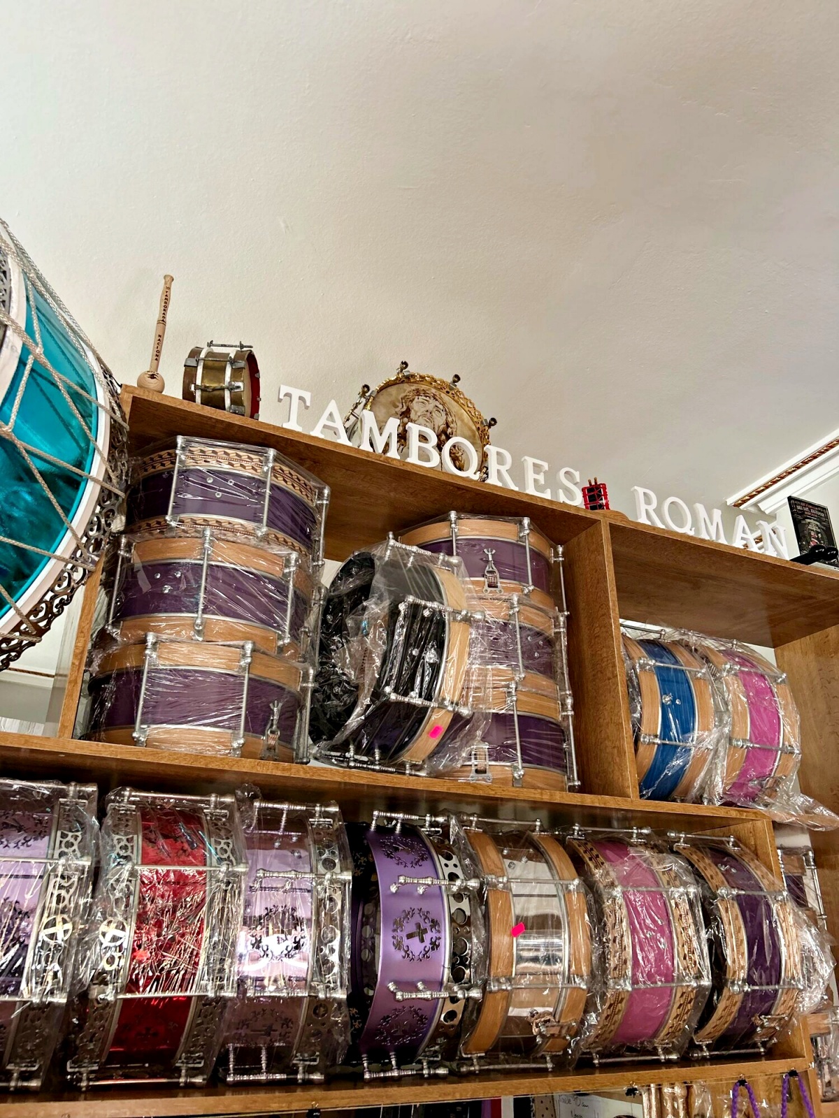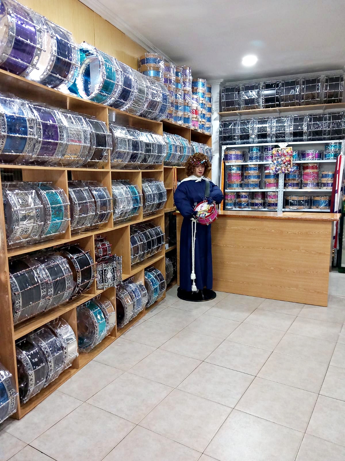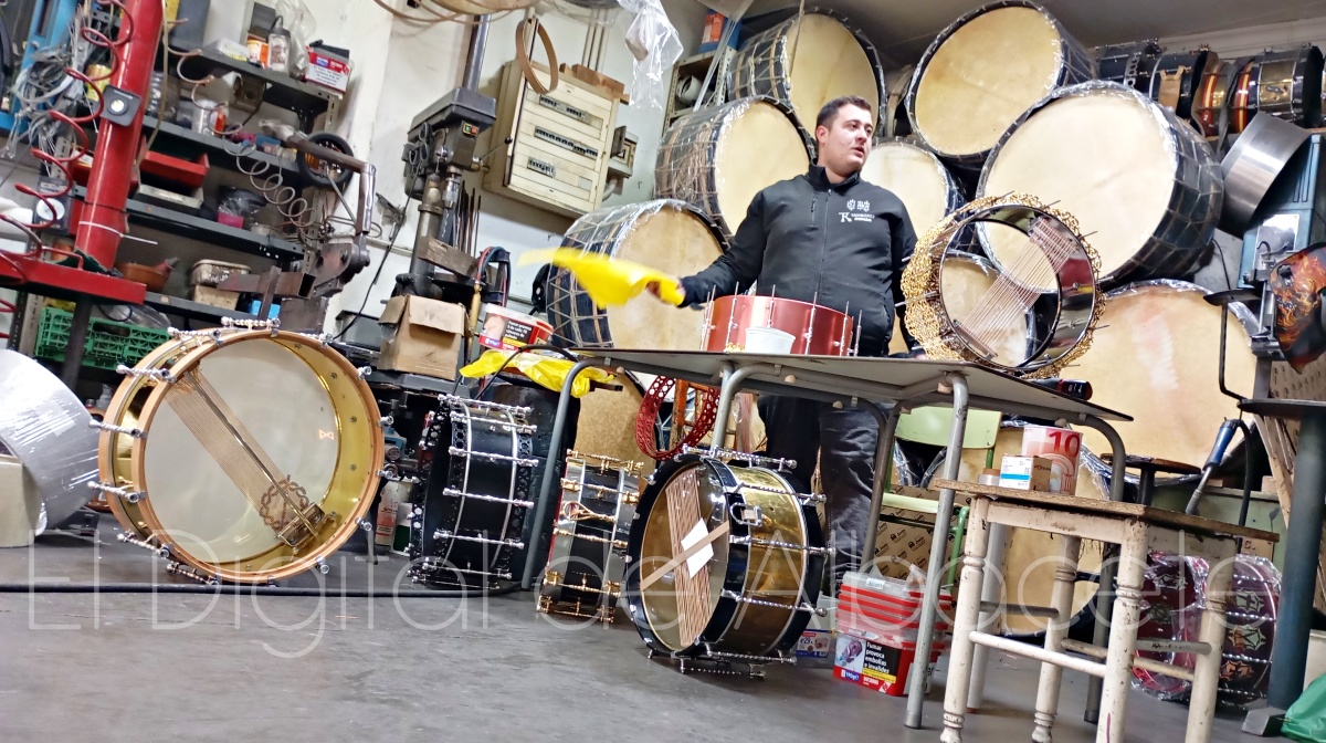 La elaboración de un tambor es un proceso minucioso que combina precisión y sensibilidad. El artesano indica que “desde la selección de materiales, hasta el montaje final, cada paso es clave para conseguir un sonido de calidad. Nosotros ajustamos cada tambor cuidadosamente para garantizar su resistencia y sonoridad. El resultado es un tambor capaz de soportar largas jornadas de toque, como las que caracterizan a Tobarra, donde el ritmo puede prolongarse durante horas. A la hora de la venta, el primer paso es en la tienda, donde tenemos infinidad de modelos de tambores diseñados y fabricados por nosotros. El cliente siempre pasa por allí para elegir los materiales, porque la madera, el metal, y el parche tienen que ser de calidad. También eligen el color, el modelo, o el tamaño, con el fin de encontrar el tambor de sus sueños. Si entre todos los que hay no lo encuentra, podemos fabricar uno personalizado, a gusto del cliente, eligiendo desde la primera pieza hasta la última. Para este tipo de tambores personalizados, solemos tardar unos 6 meses en tenerlos listos, porque suelen ir tallados a mano con los motivos que elijan. Además de cuidar todo el exterior del tambor, tanto a nivel de calidad como de estética, nos centramos mucho en lo que lleva dentro. Y es que, cada tambor lleva en su interior la ‘bordonera’, responsable de darle a la caja el sonido característico de Tobarra, brillante, metálico y con ataque”.