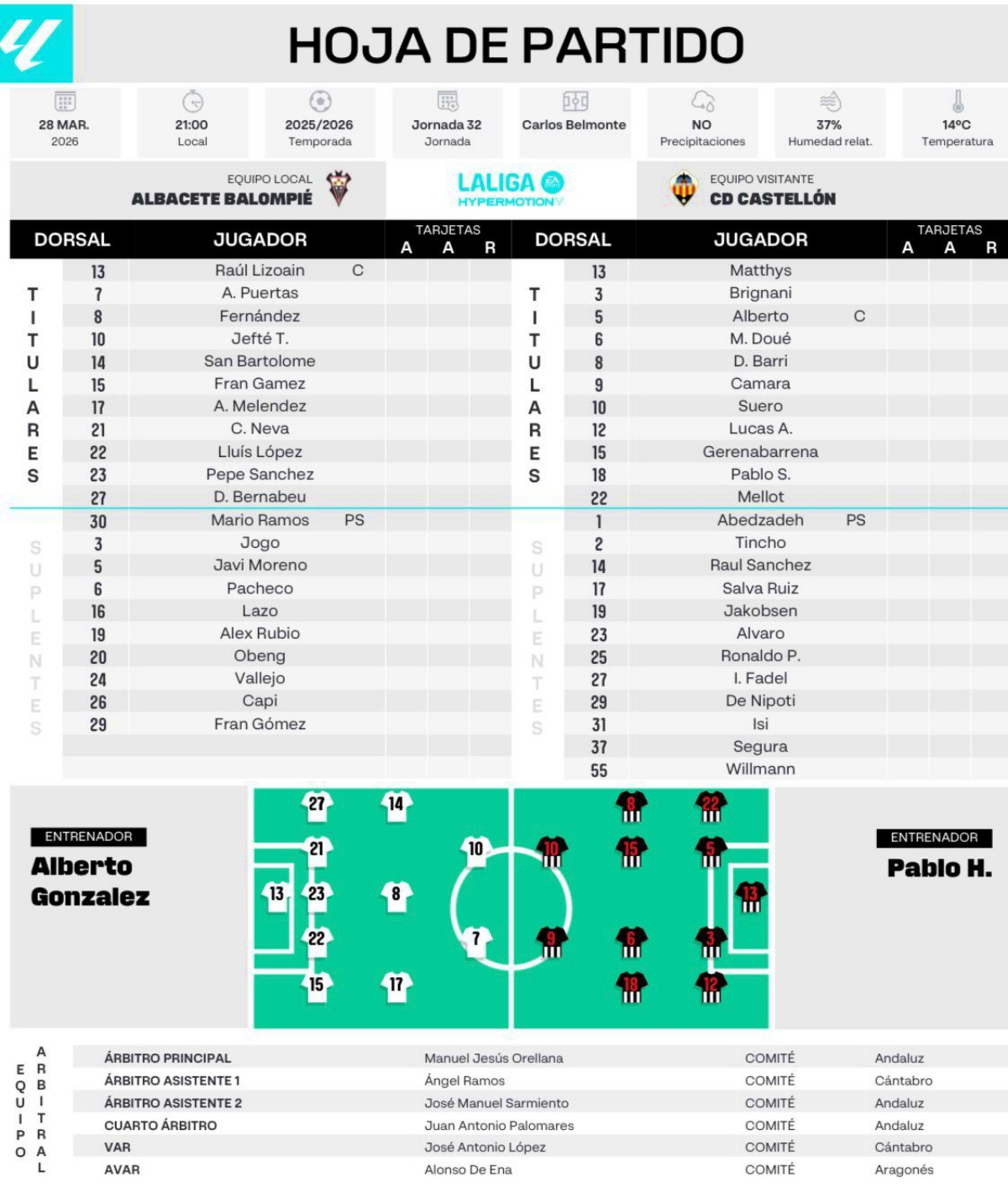 En lo que a lo que fue el partido en sí respecta, volvía a rodar la pelota este sábado en el Carlos Belmonte y lo hacía para enfrentar al Albacete Balompié a, junto a los de Alberto González, a uno de los equipos más impredecibles del campeonato y que practica un fútbol más vistoso como es el CD Castellón, quien llegó a ser líder de la tabla no hace mucho tiempo pero que, a partir de ahí y quizá debido al mal de altura, comenzó a caer en picado y llegaba al Carlos Belmonte tras haber sumado únicamente dos de los últimos quince punto en juego.