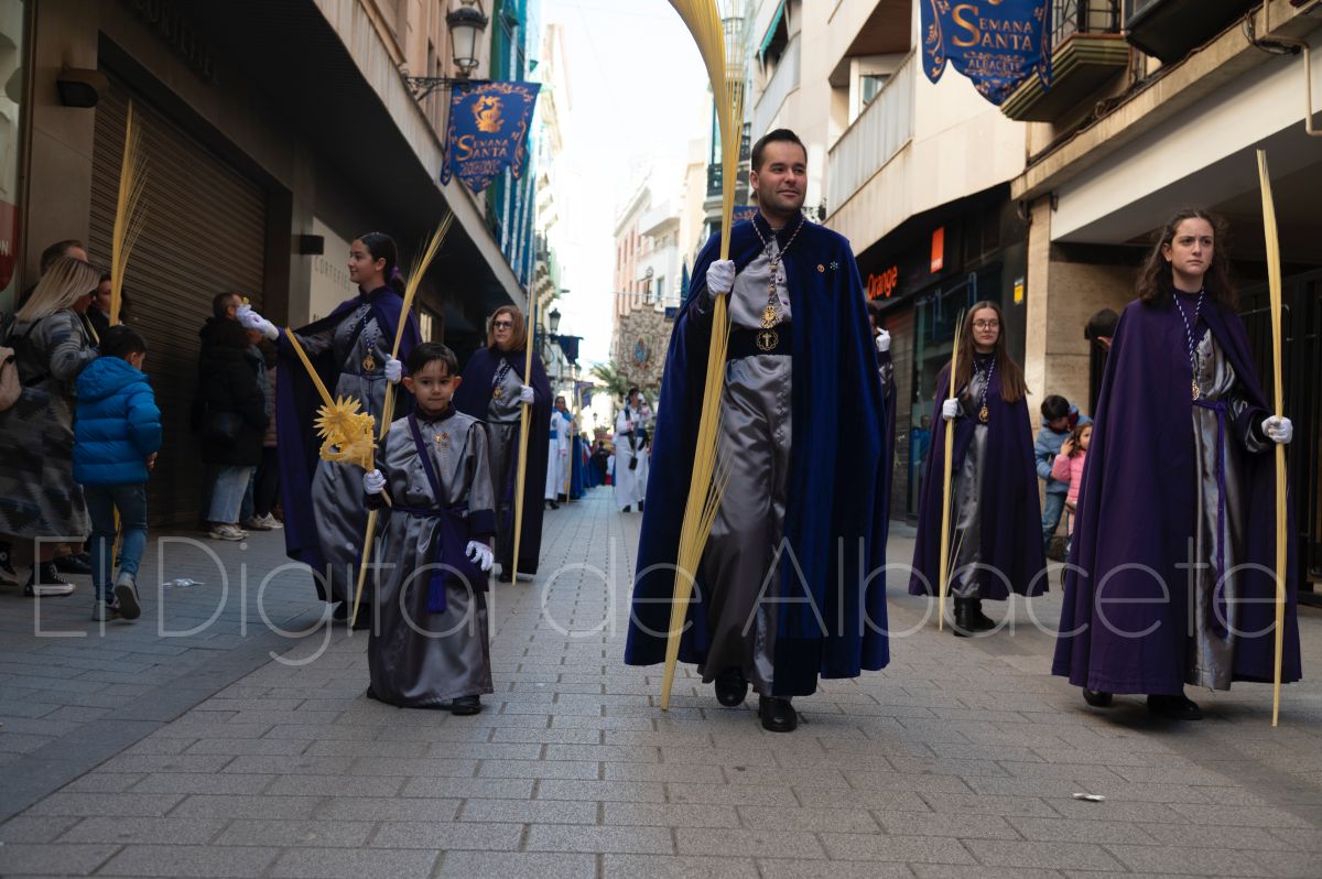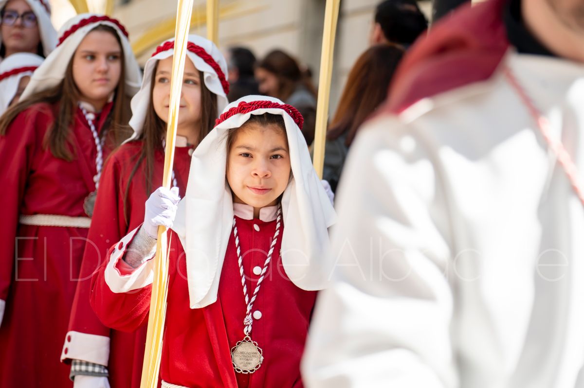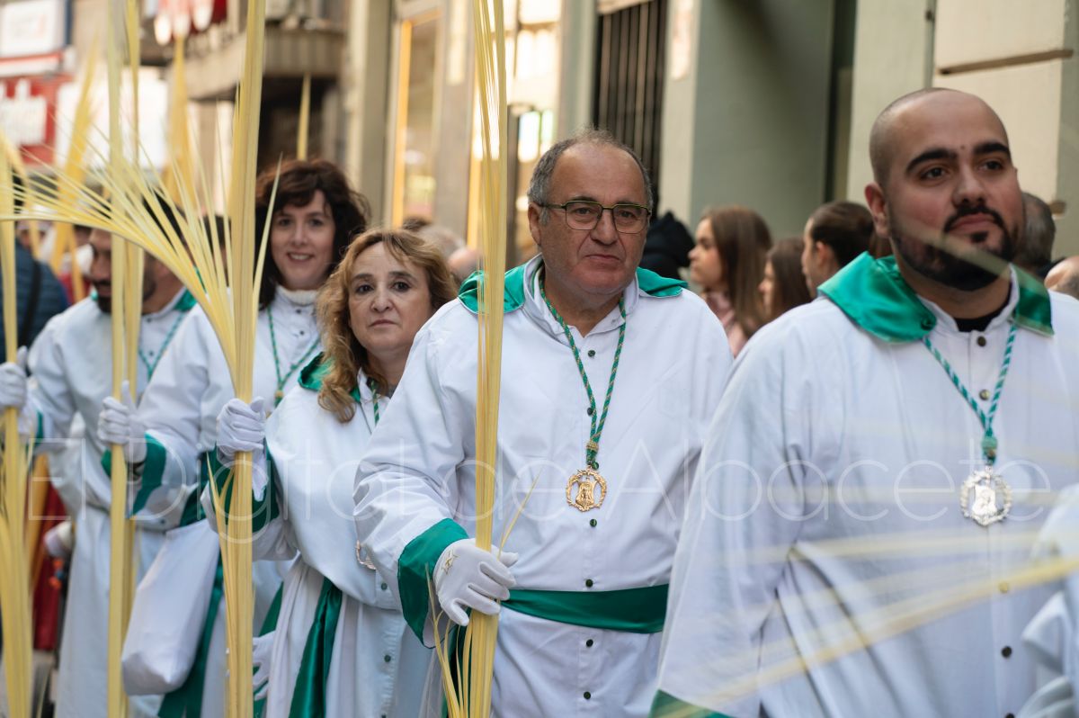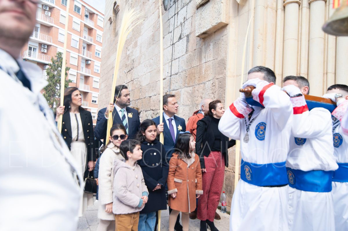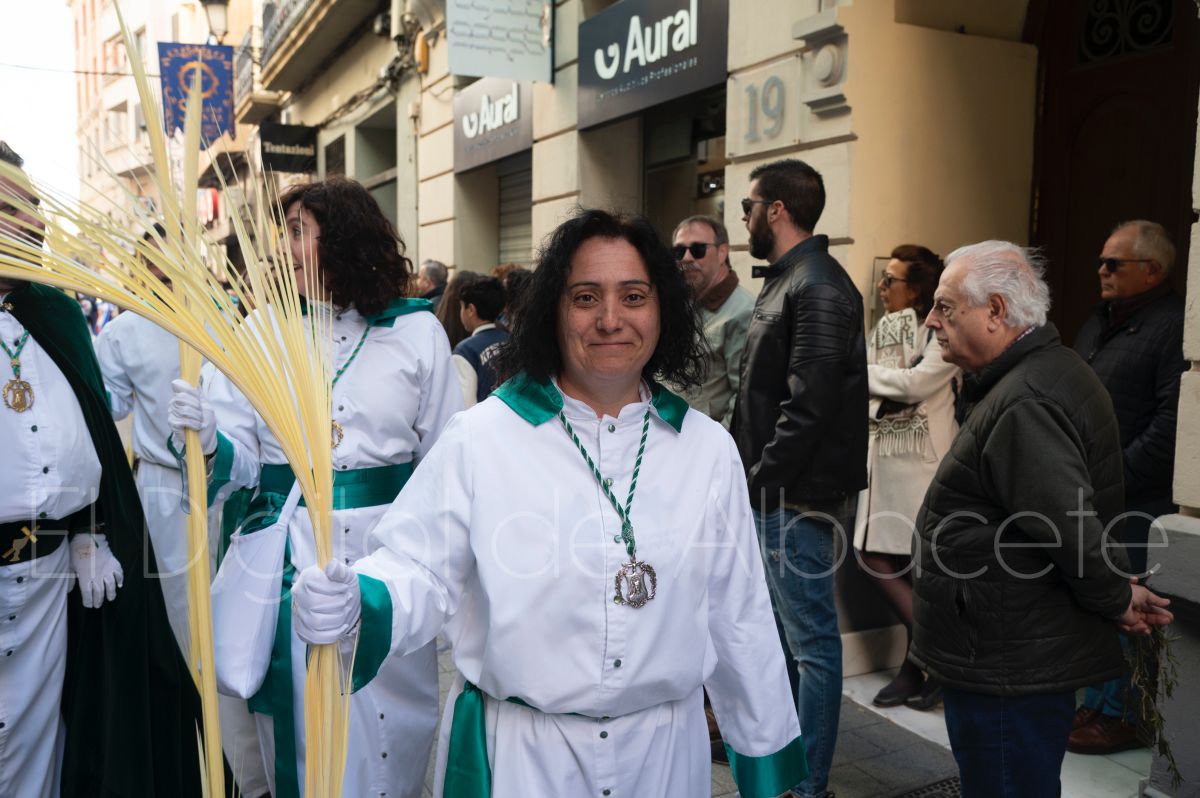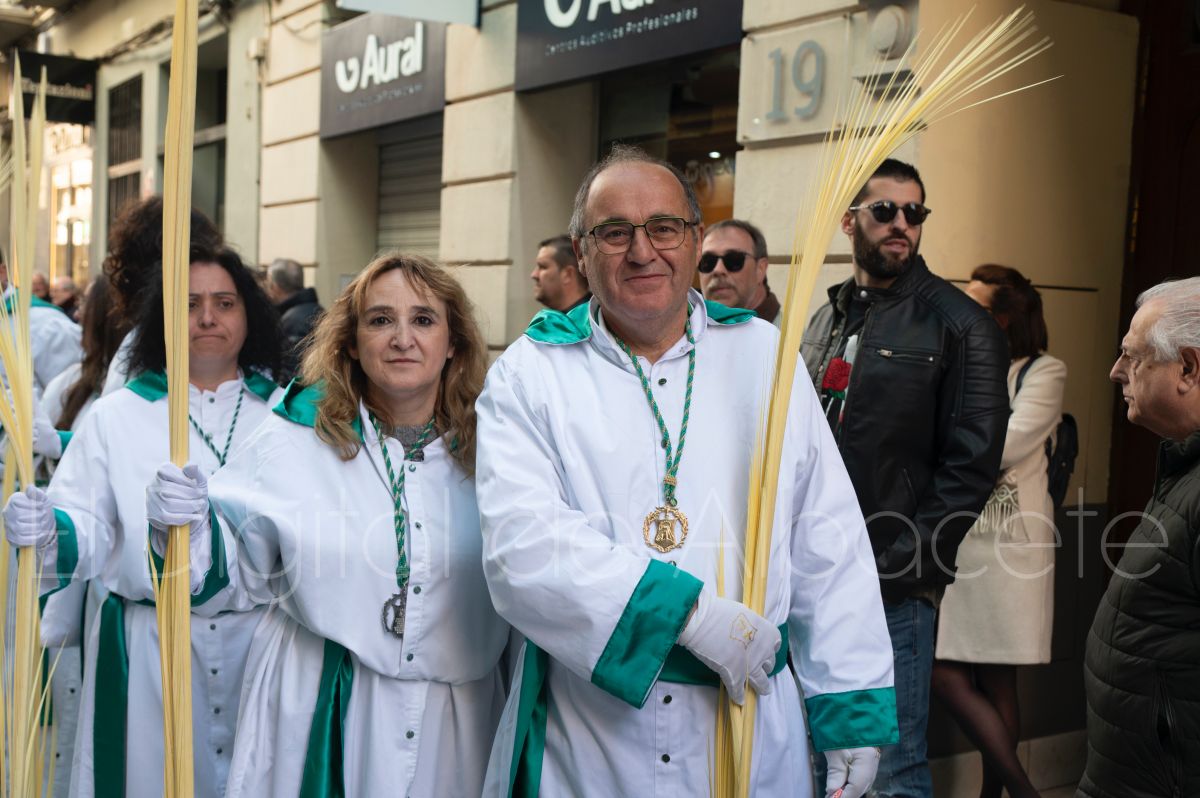 Tras la tradicional bendición de las palmas y ramas de olivo, la imagen de ‘La Borriquita’ salía de la Catedral de Albacete. Así, acompañaban a esta popular imagen en su discurrir por las calles de Albacete nazarenos la Cofradía de Nuestra Señora del Mayor Dolor que prescindían de los tradiciones capuces y mostraban su rostro en esta jornada dominical, conmemorando la entrada de Jesús en Jerusalén.