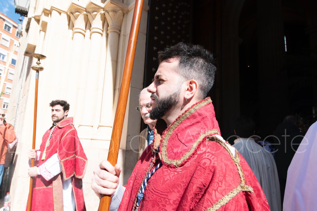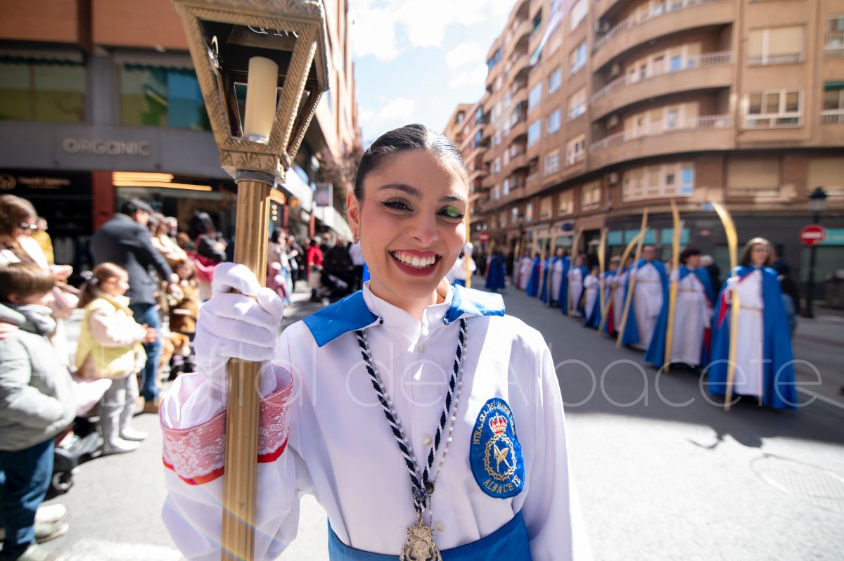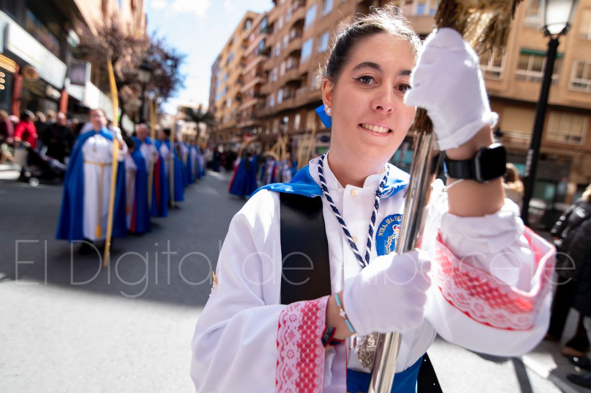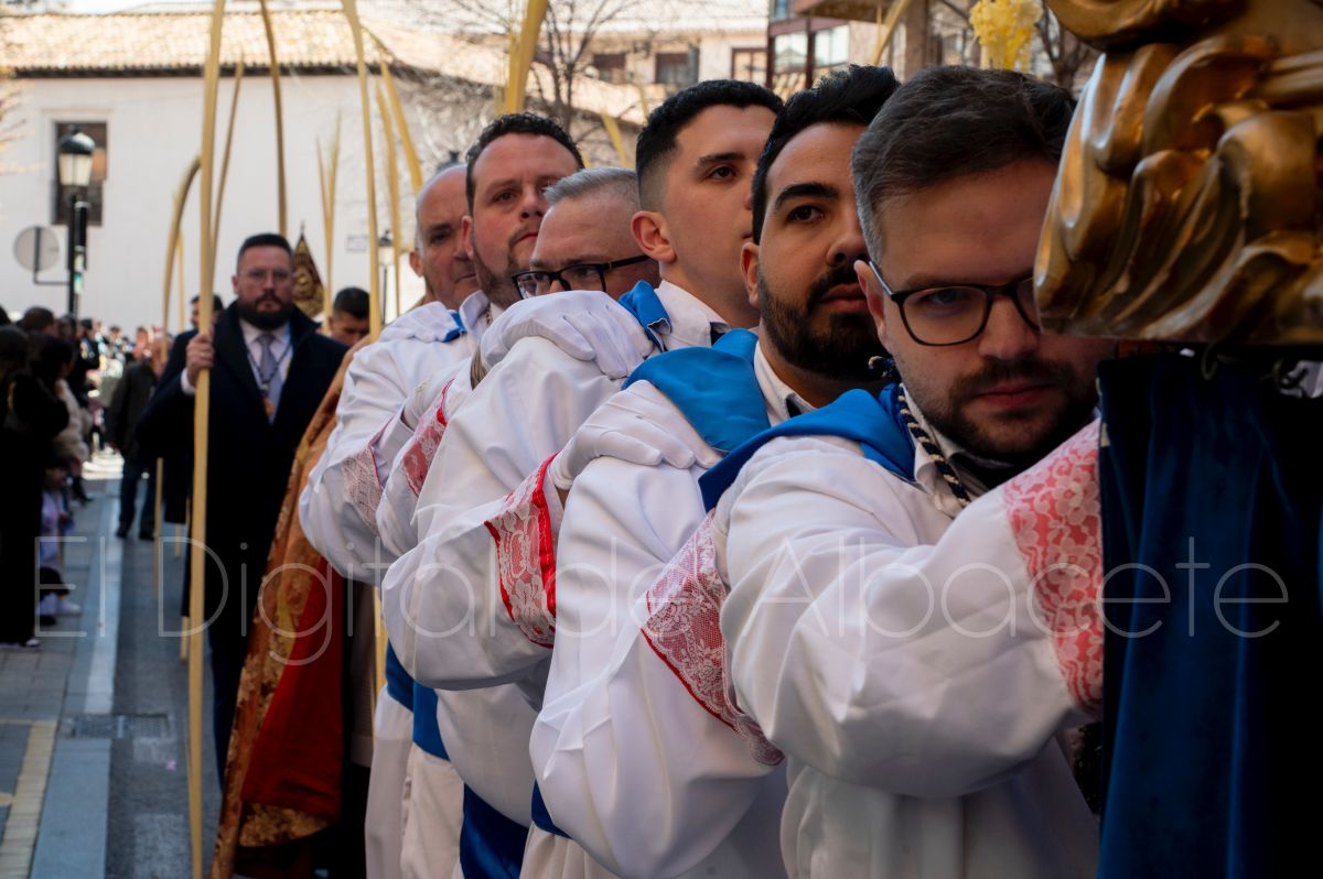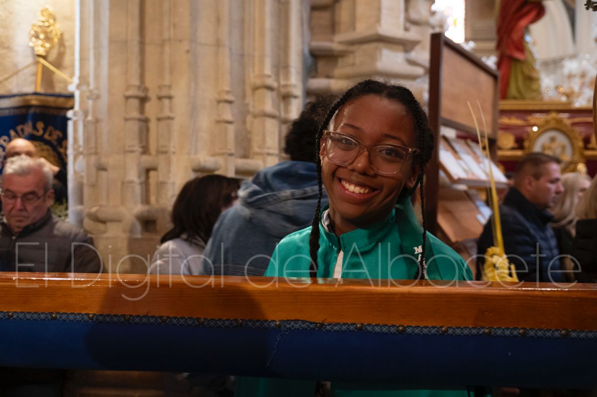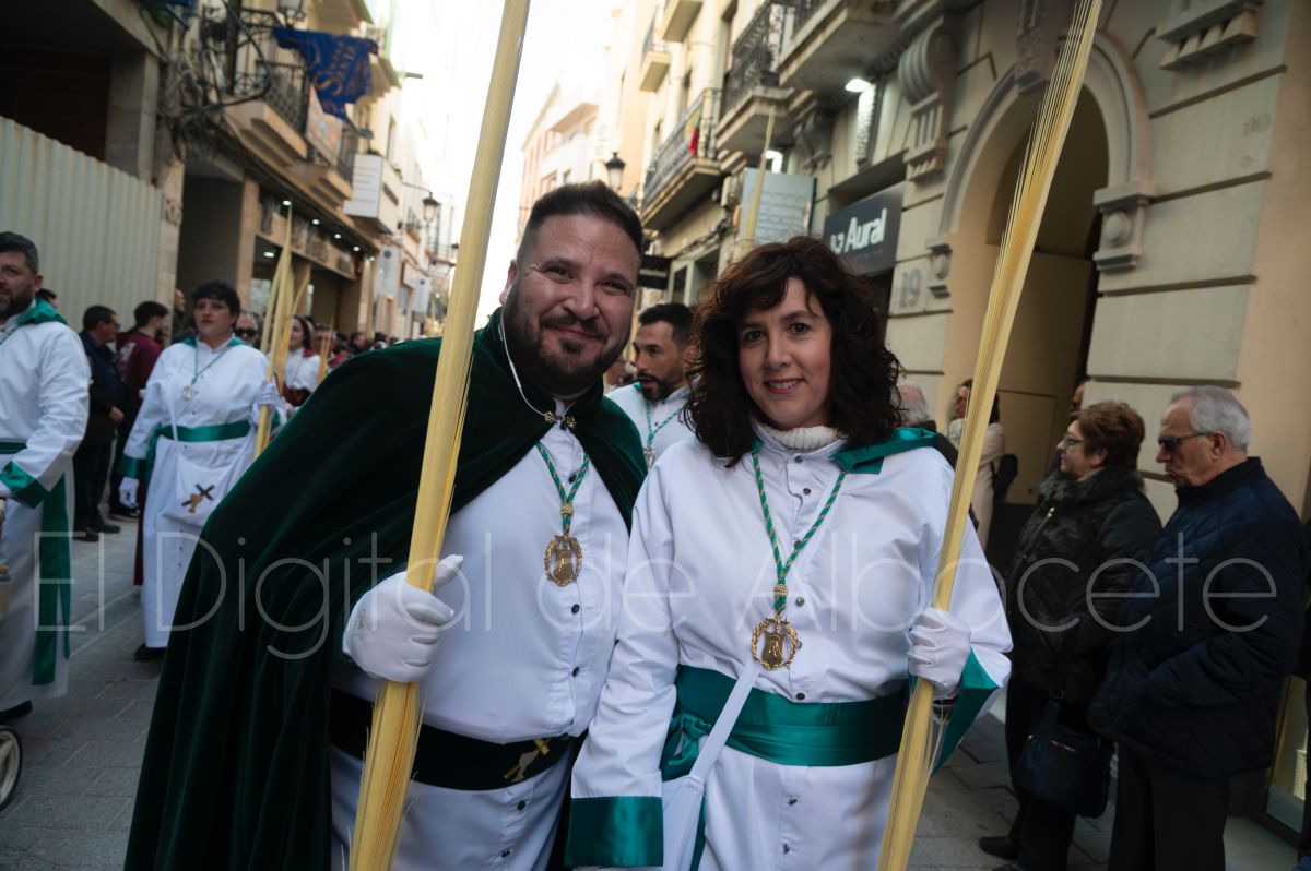 Tras la tradicional bendición de las palmas y ramas de olivo, la imagen de ‘La Borriquita’ salía de la Catedral de Albacete. Así, acompañaban a esta popular imagen en su discurrir por las calles de Albacete nazarenos la Cofradía de Nuestra Señora del Mayor Dolor que prescindían de los tradiciones capuces y mostraban su rostro en esta jornada dominical, conmemorando la entrada de Jesús en Jerusalén.