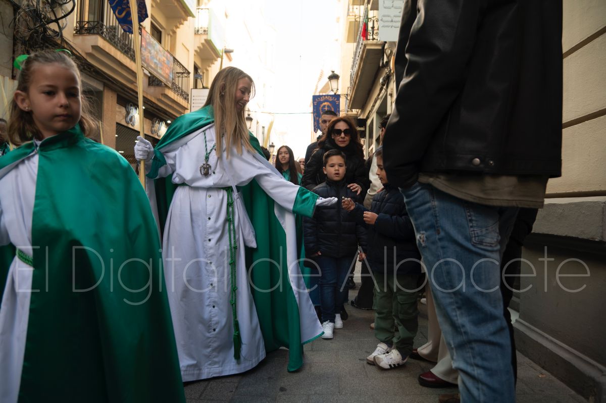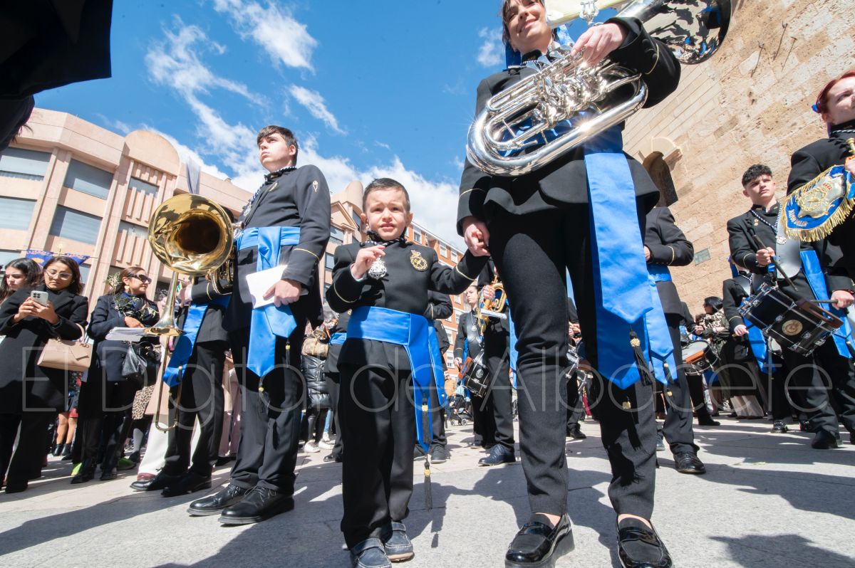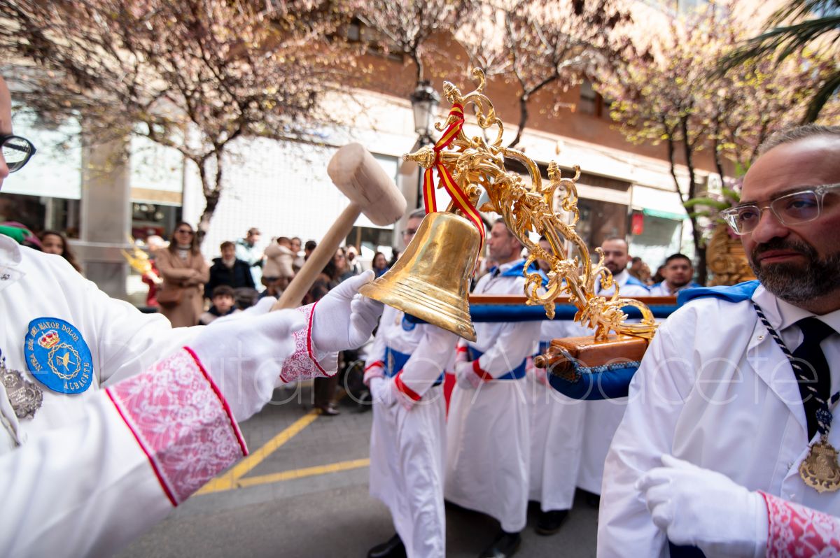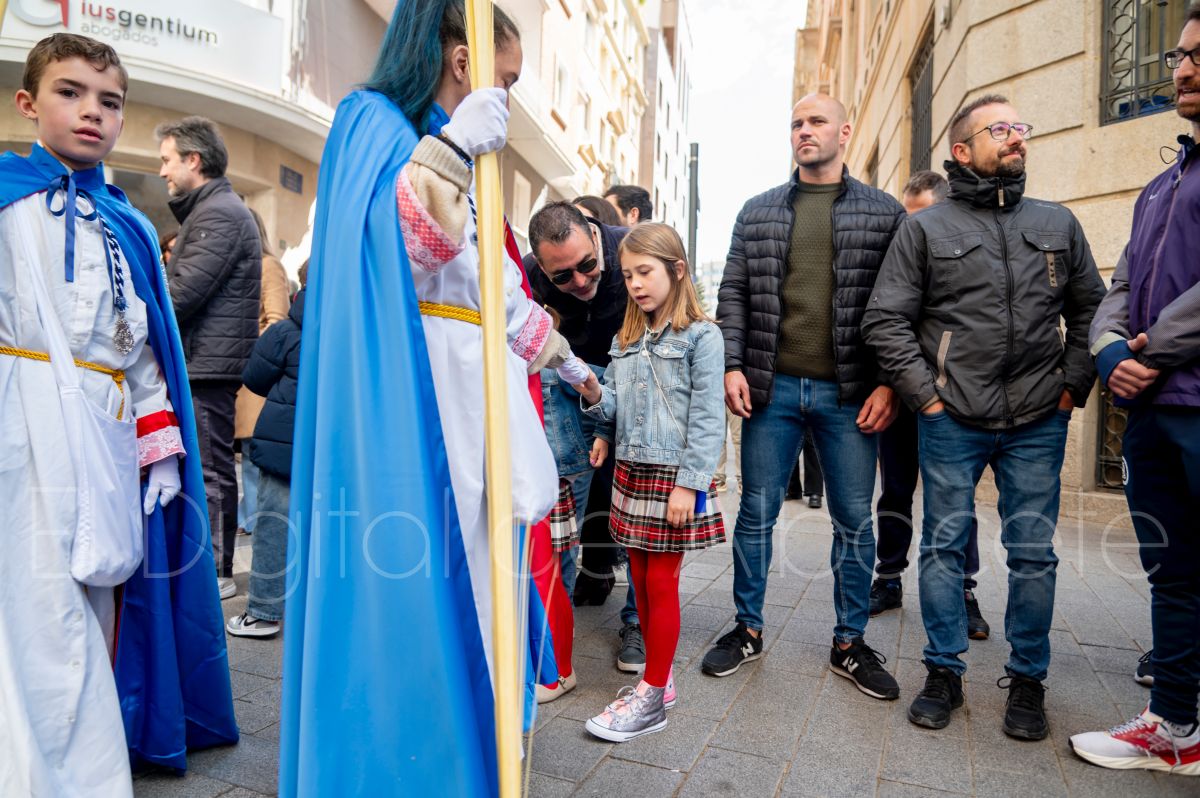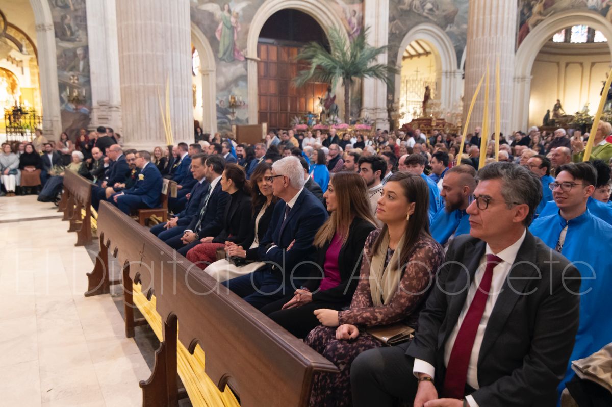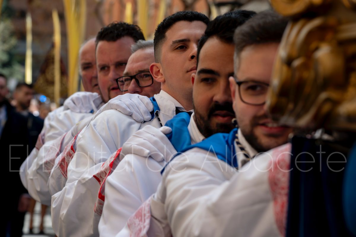 Tras la tradicional bendición de las palmas y ramas de olivo, la imagen de ‘La Borriquita’ salía de la Catedral de Albacete. Así, acompañaban a esta popular imagen en su discurrir por las calles de Albacete nazarenos la Cofradía de Nuestra Señora del Mayor Dolor que prescindían de los tradiciones capuces y mostraban su rostro en esta jornada dominical, conmemorando la entrada de Jesús en Jerusalén.